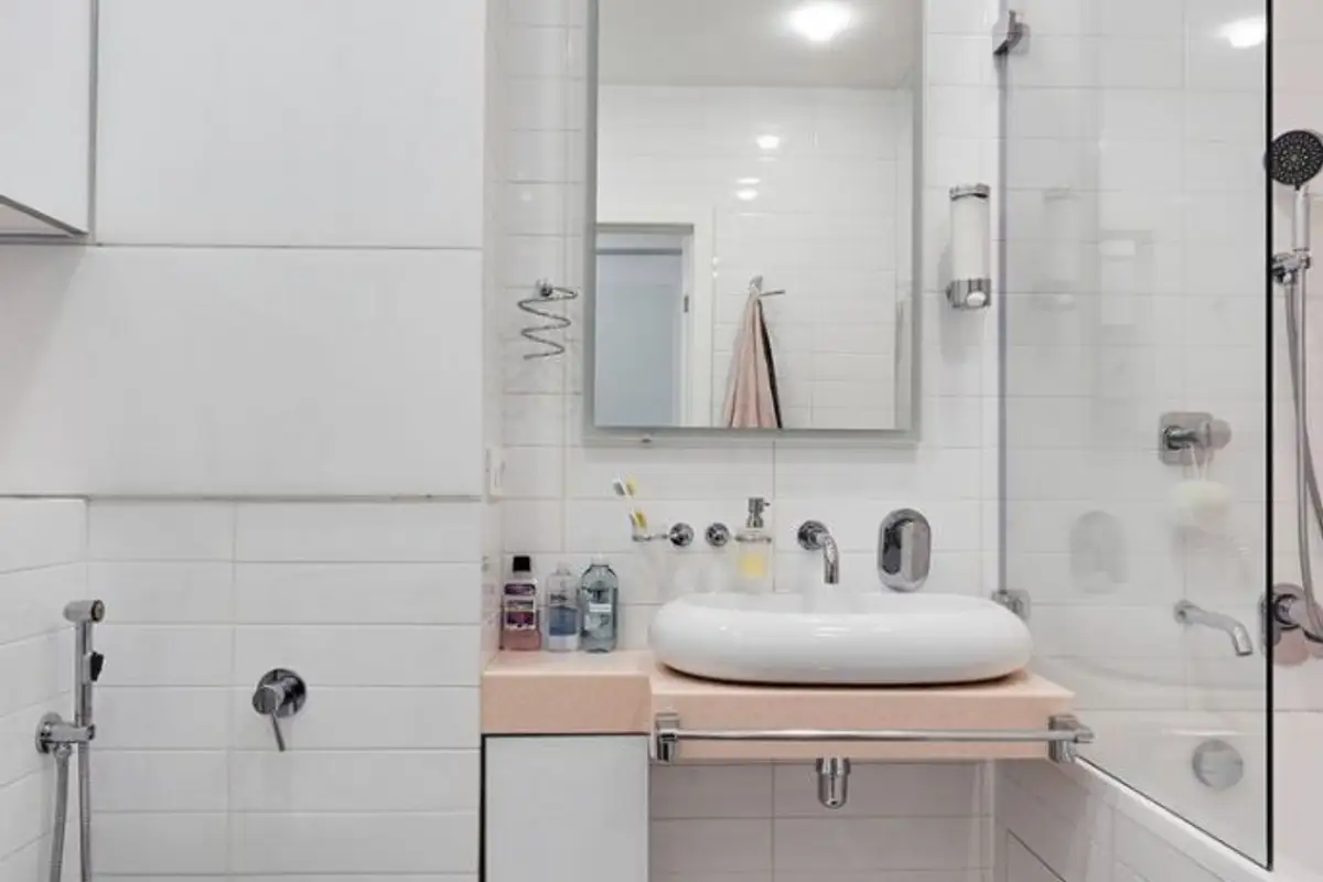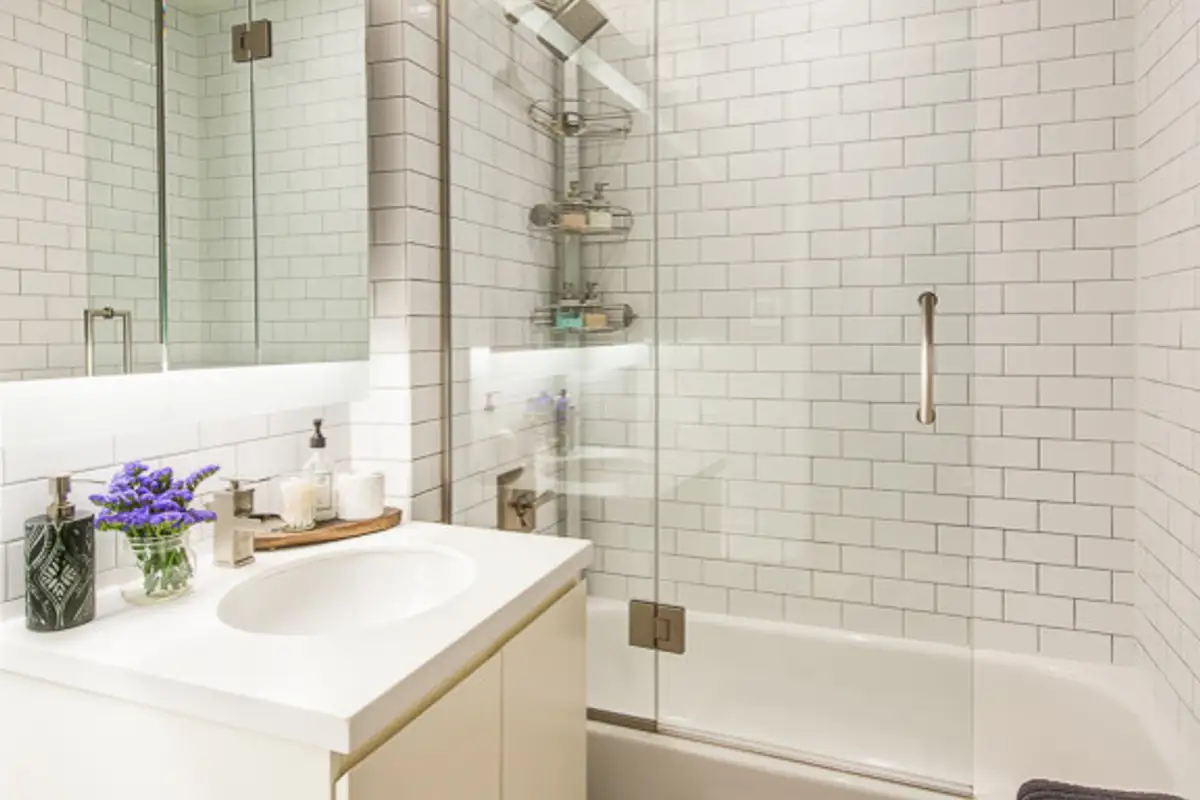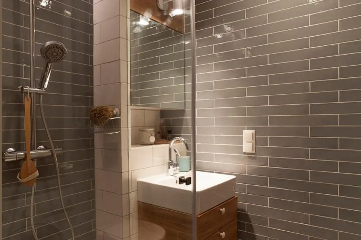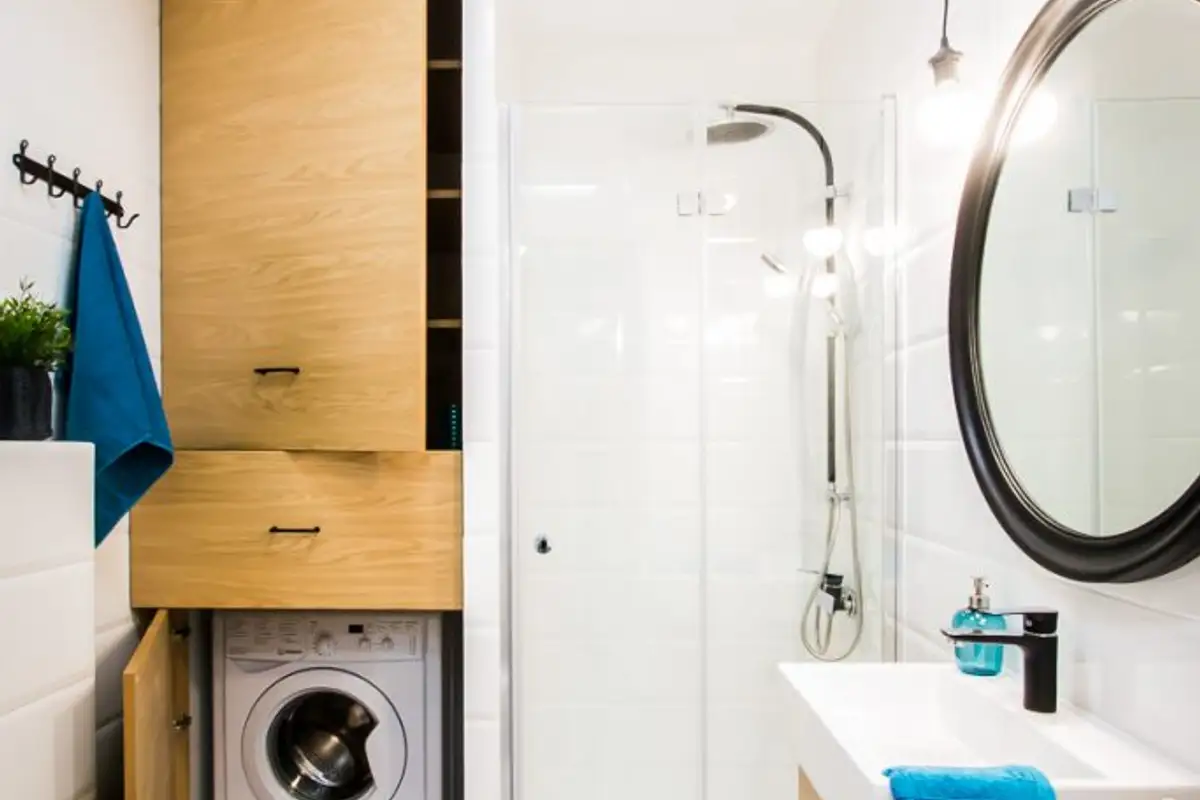 To optimize the space in a small bathroom, it is recommended to replace the bathtub with a walk-in shower cabin. This will leave you with more space in the bathroom to bring in a washing machine or more storage space.