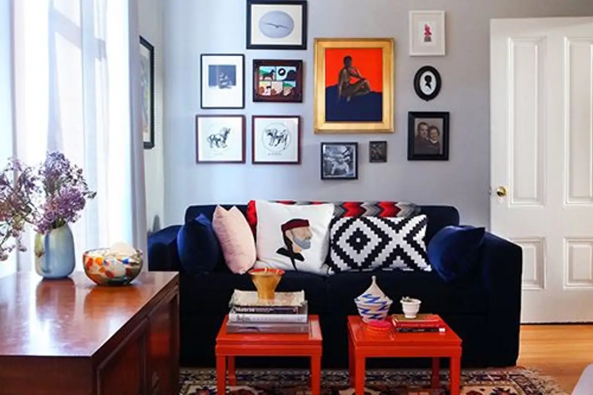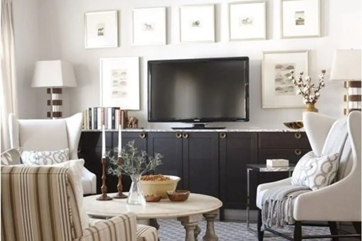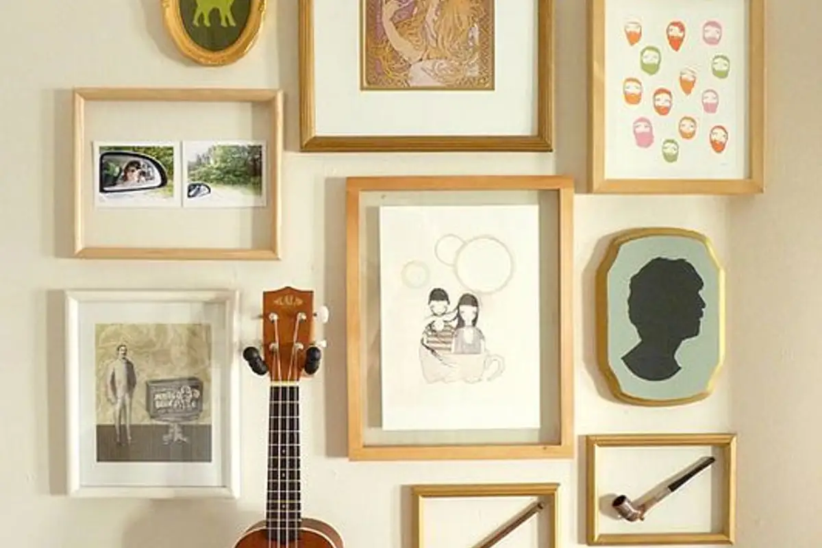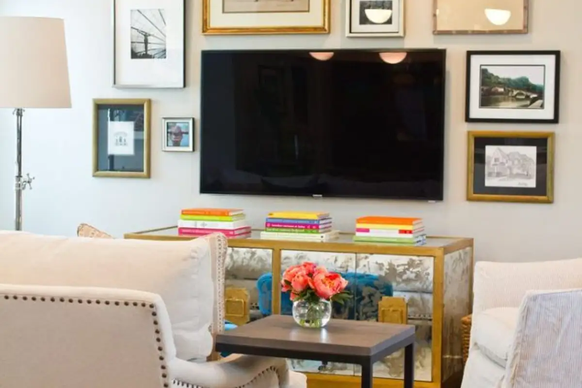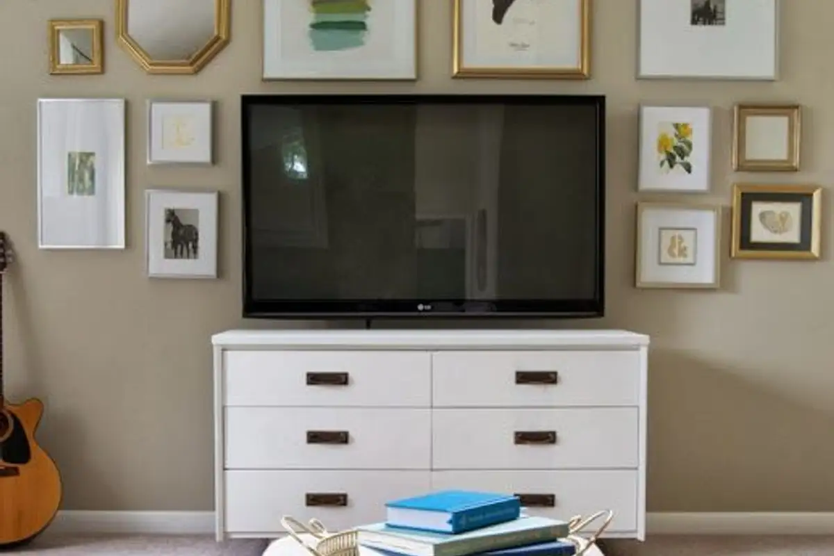 The space around the television enhanced with various paintings on an accent wall in a small space.