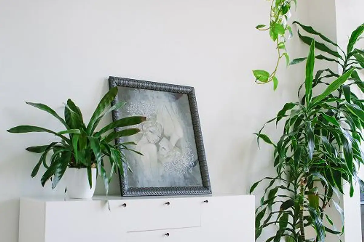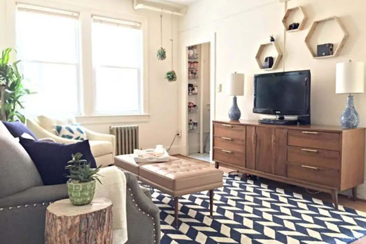 A small space arrangement with a multitude of elements such as the space around the television, hanging plants, a rug with a bold pattern and a multifunctional coffee table.