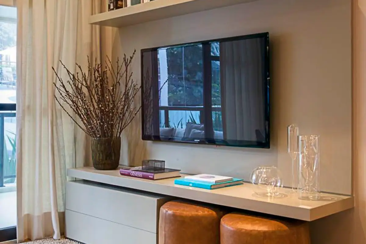 Arranging the space around the television. Being a small space, here's how the two ottoman-type chairs were integrated into the furniture. An excellent idea!