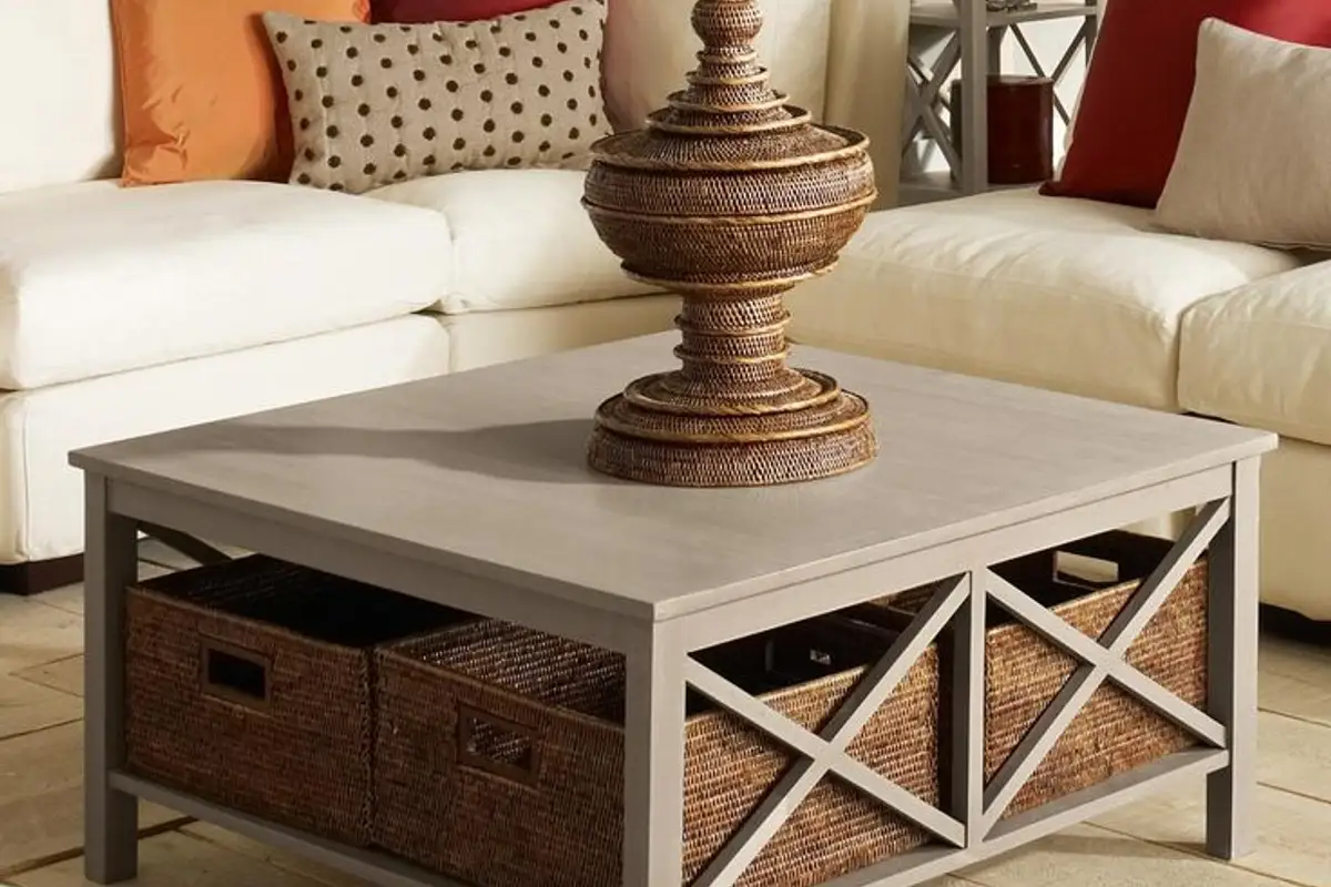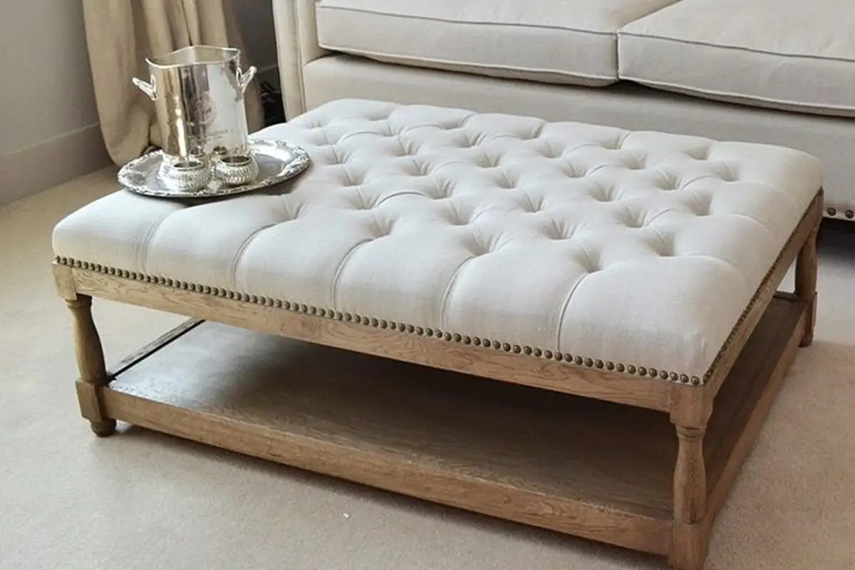 An ottoman-type chair refurbished and arranged as a coffee table on which you can also sit.