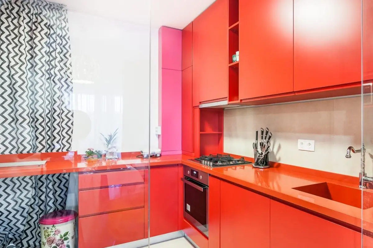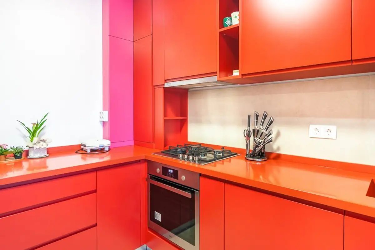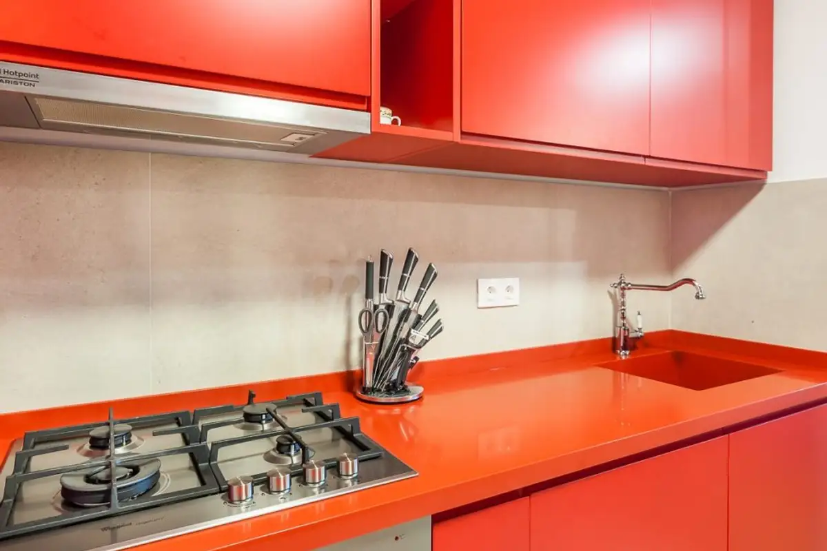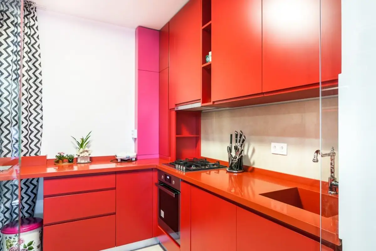 Probably the reddest kitchen in the world, that's how the team at Corespace describes this arrangement. The project came to life thanks to some brave beneficiaries, namely a family with two children who wanted a very colorful home.