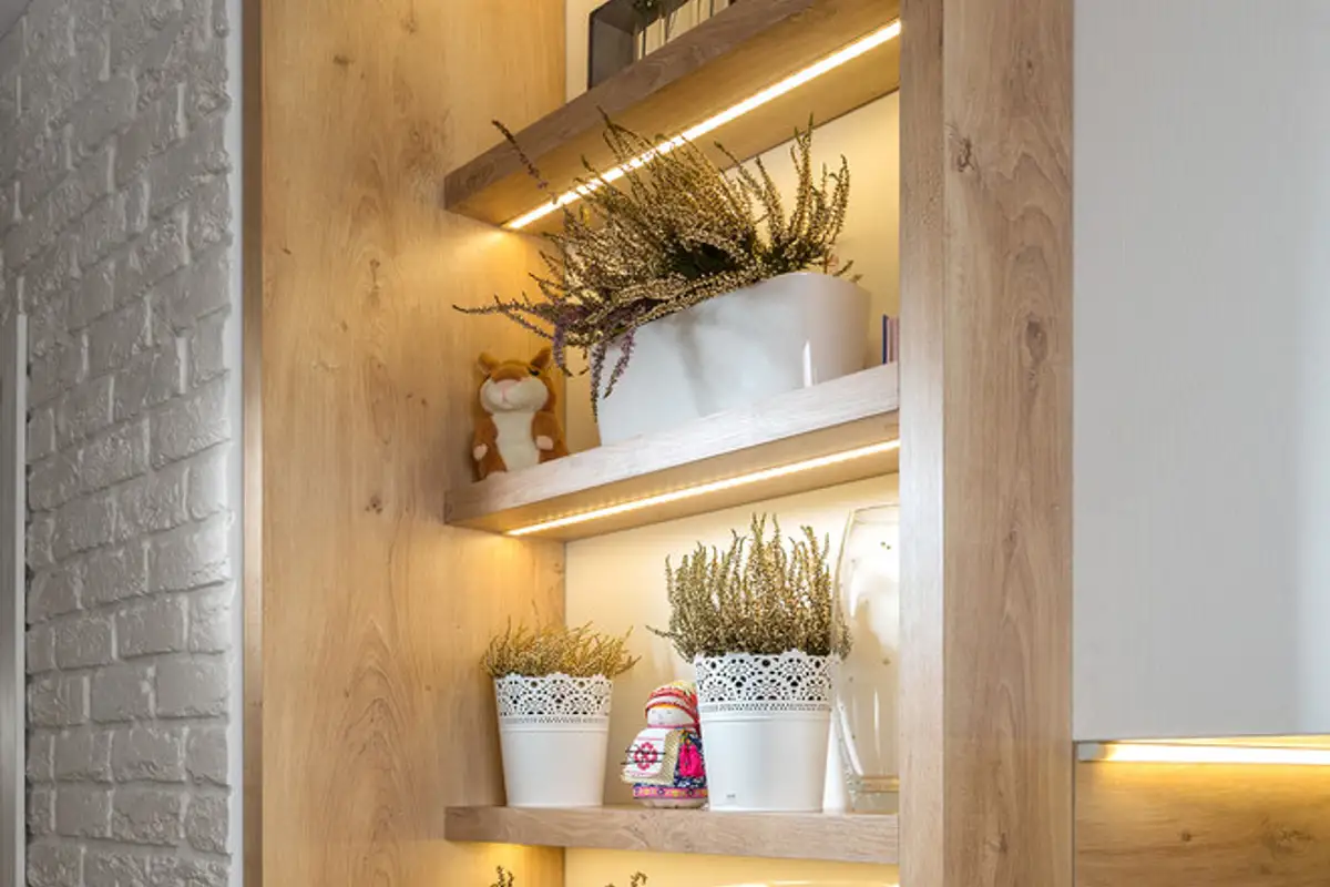 Lighting is an important part of the design. LED strips placed under the lower furniture and under the shelves create a diffused light effect that increases visual comfort while still maintaining the intimacy of the space.