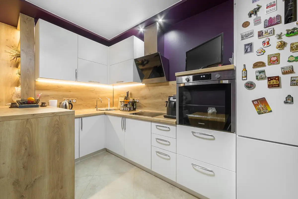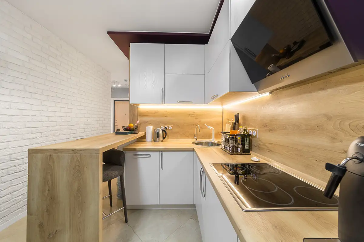Such a kitchen where warm tones blend with cool ones can only be admired. Its dimensions are not at all impressive; we could say that it doesn't deviate from the pattern of small kitchens we are used to.