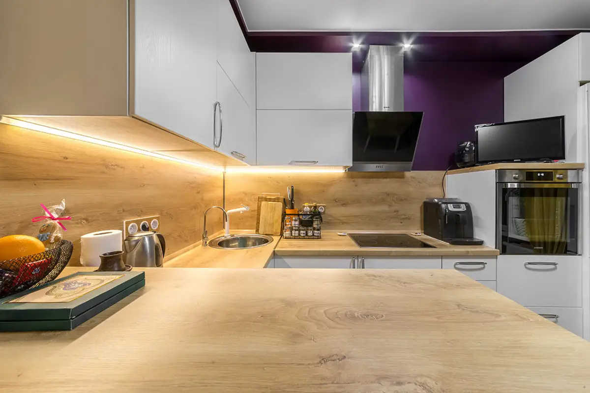 The wood used for the kitchen countertop extends towards the upper cabinets and covers the wall. The layout follows a modern line, with neutral chromatic aspects, white furniture, and three walls with strong color accents.