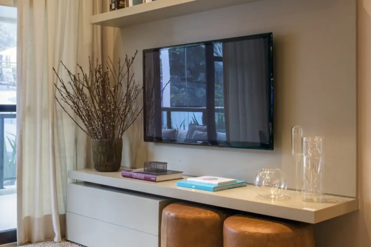 For the living room, only strictly necessary furniture pieces were chosen. The sofa is placed against the wall, and opposite it, a panel with 2 shelves was designed, with the television positioned in the middle. By choosing such a piece (see also the height), space could be created for 2 ottoman-type armchairs perfectly integrable under the shelf.