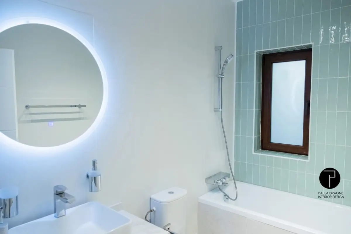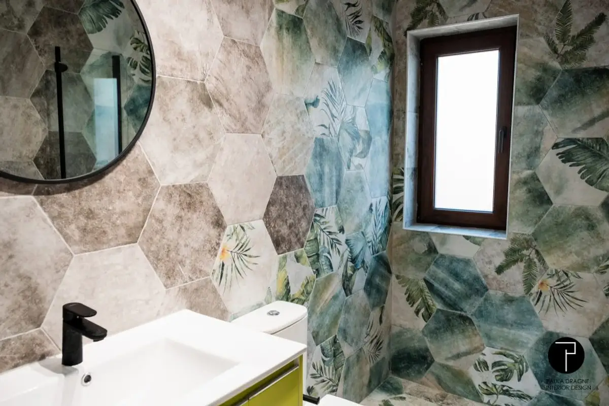 The two bathrooms, the master bathroom with a walk-in shower and the hallway bathroom with a bathtub, were approached differently, each having its own strong personality. The hallway bathroom was designed in light, pastel shades of green and cream, while the master bathroom attracts attention with its vibrant colors and hexagonal tile cladding with exotic floral motifs.