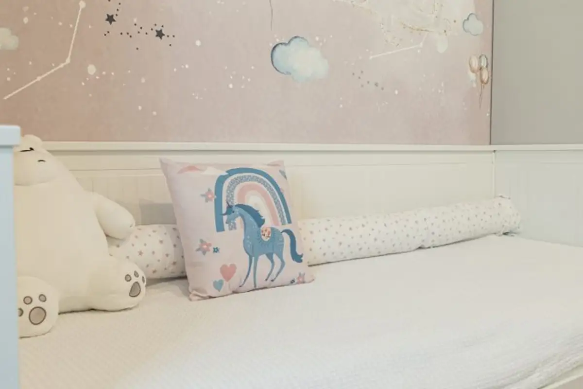 The night area consists of the master bedroom with its own bathroom and a generous dressing room, and the little girl's room, seemingly straight out of a pastel-colored storybook.