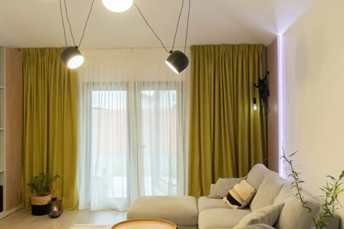 On the ground floor we find an open space, where all the functions of a living area are harmoniously integrated: living room, kitchen, hallway, dining area. All these areas have been furnished modernly and uniformly, which makes the space appear larger and brighter. A few metal accents and the design of the chosen lighting fixtures hint at an industrial style.