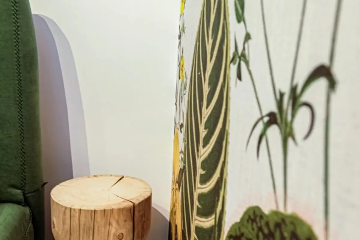Thus, the interior designer proposed using wood (both as finishing accents on walls, in fixed furniture, and in various small furniture pieces and decorations), a color palette based on shades of green, and decorating certain accent areas with wallpaper featuring nature-inspired motifs.