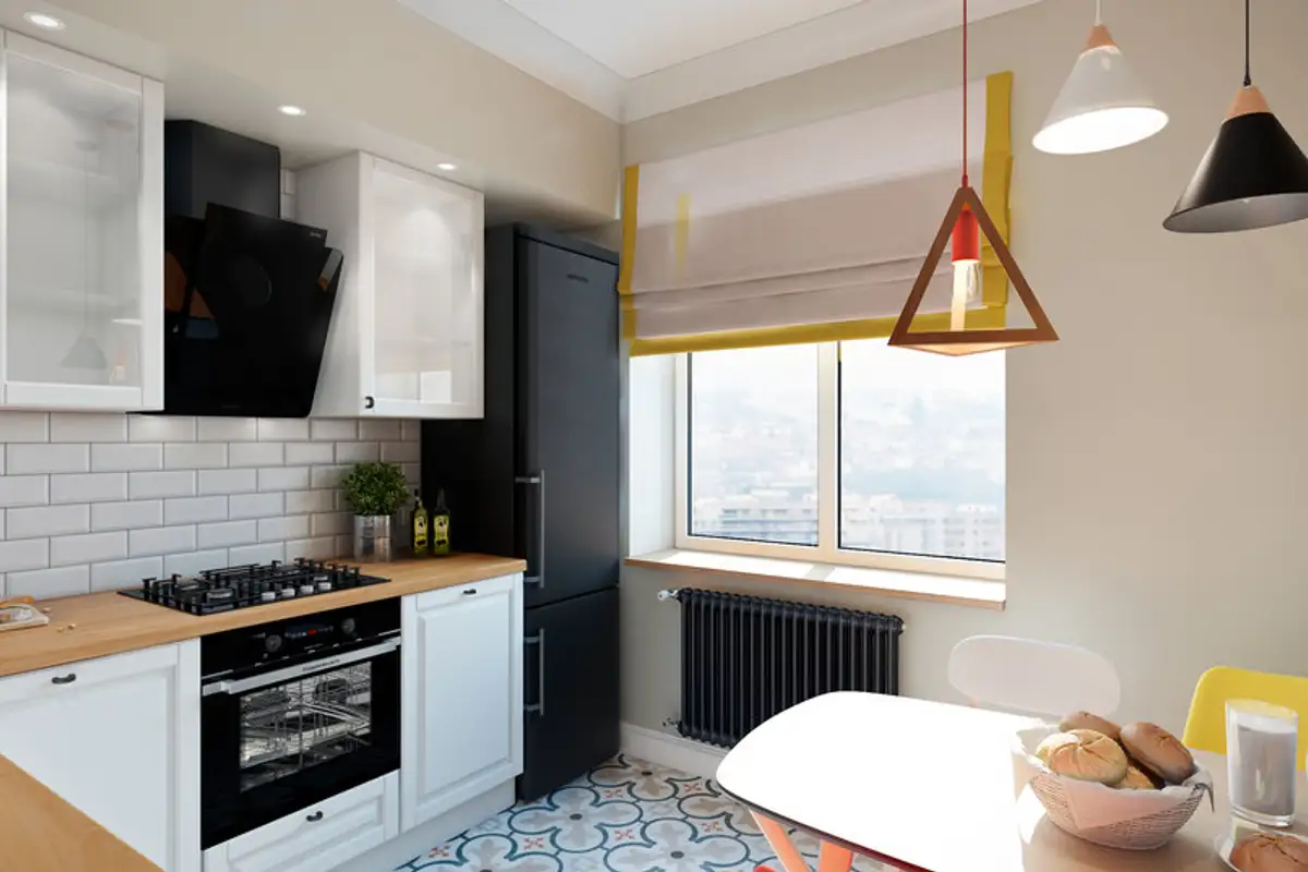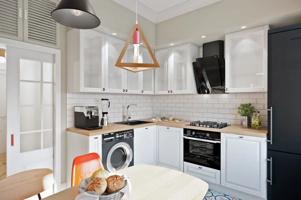 The kitchen is important for this family. In the 10 square meters, they integrated storage spaces, necessary appliances, and a dining area. The furniture was arranged on two sides, thus ensuring an optimal layout of the work zones. Neutral tones predominate, from the white of the cabinets, the ceramic tiles, or the wood texture of the countertop.
