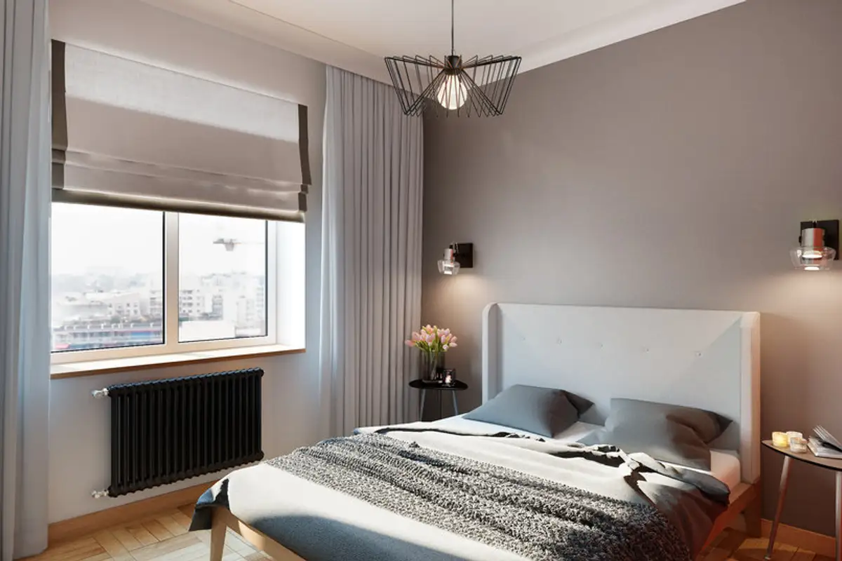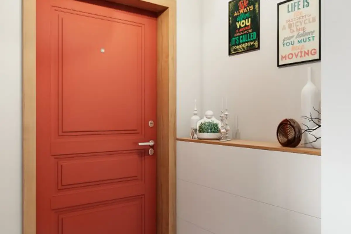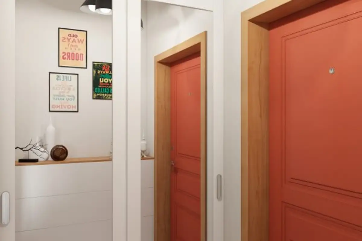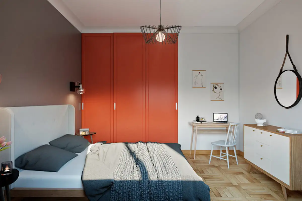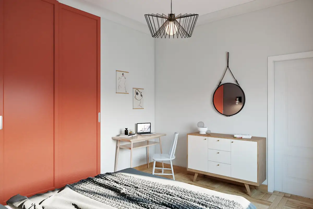 The bedroom will also feature a red accent, reminiscent of the connection with the living room through the relocation of the access from the hallway. The color scheme is subdued despite the use of red on the wardrobe doors. The bed occupies the central zone, complemented by two bedside tables. The dresser also reprises the retro motif of the living room furniture in a coherence of details.