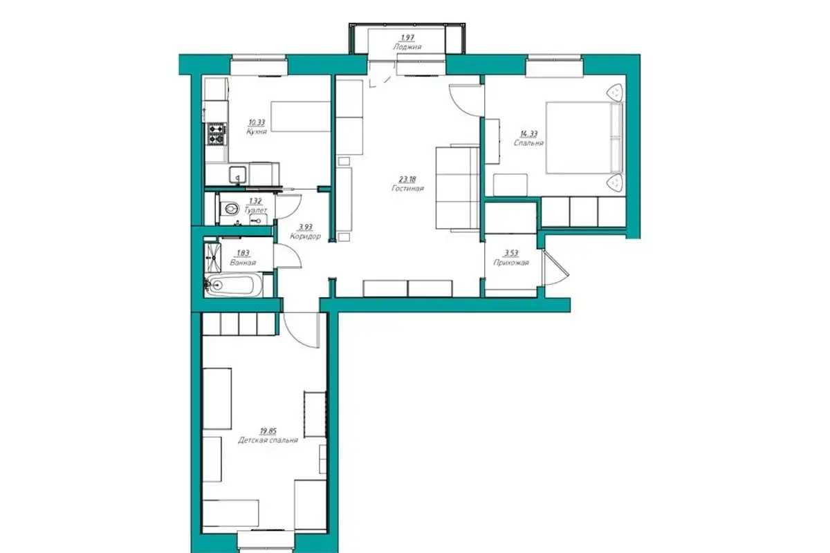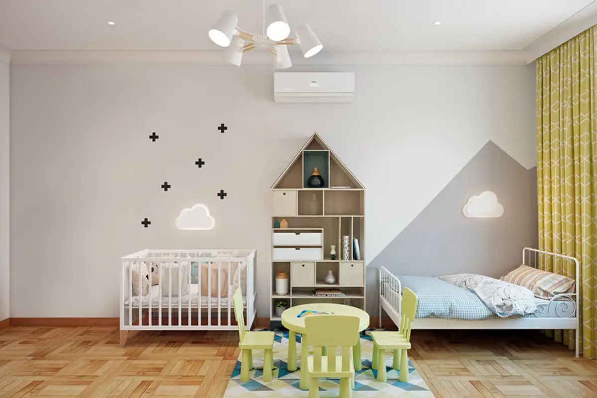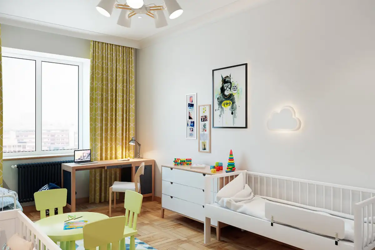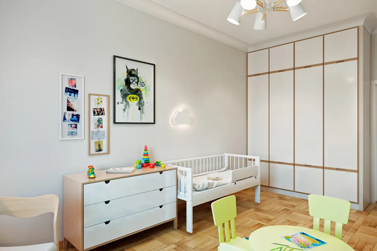After the living room, the children's room is the most spacious in this apartment. It has almost 20 square meters and includes two beds for the older children and a crib for the baby. The designers focused on creating as functional an area as possible, adding a desk by the window and a table with three chairs for the children to play.