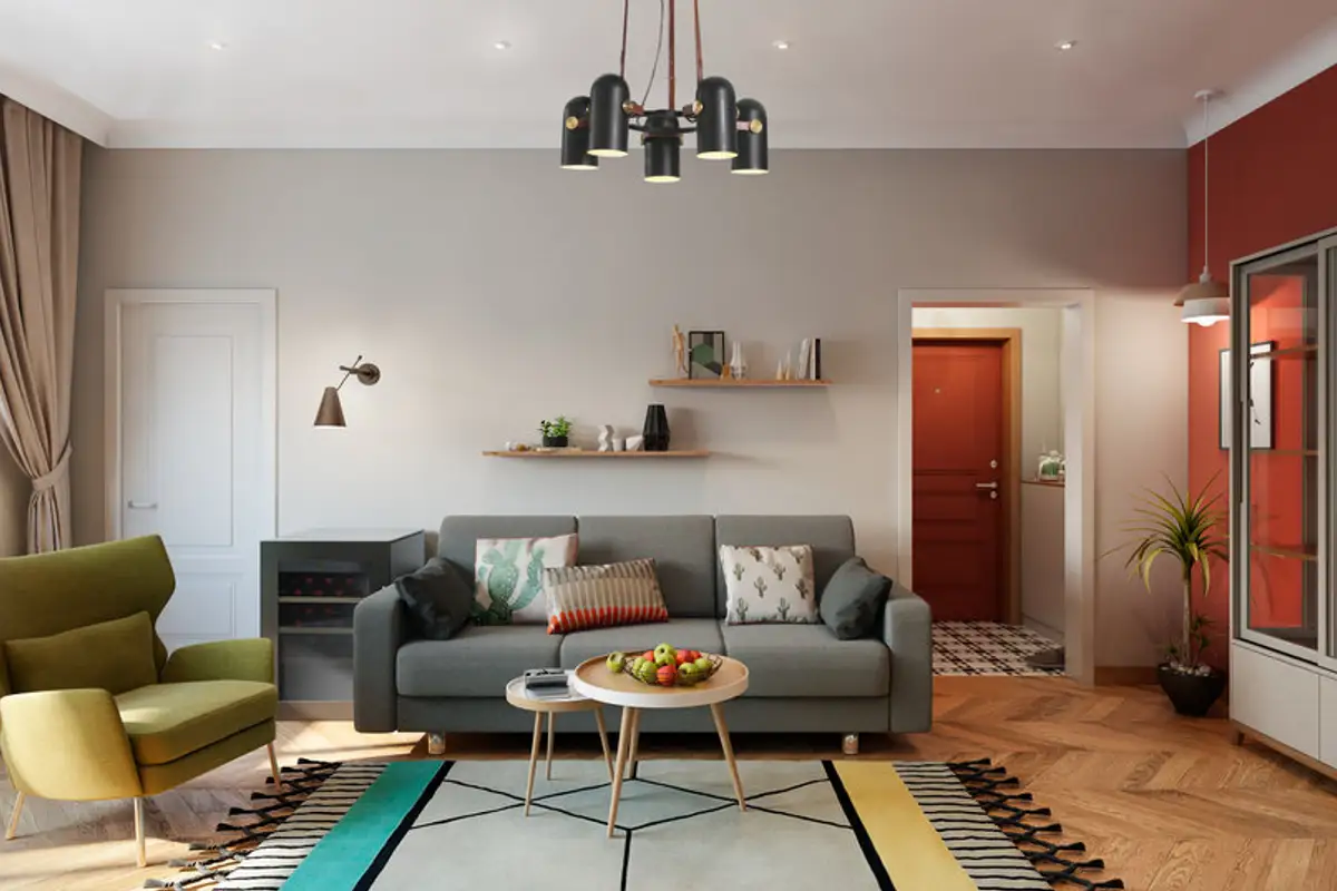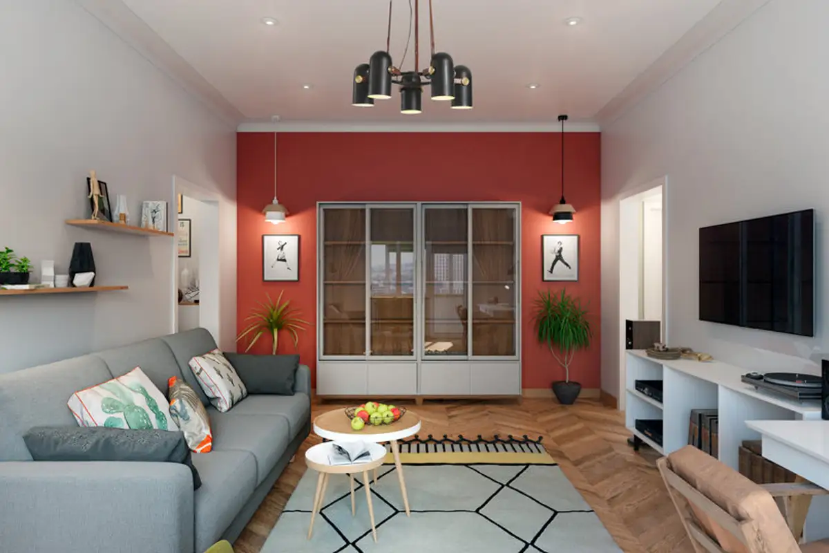 For the living room, they opted for a retro vibe (see furniture pieces with legs). The decor keeps everything as airy as possible, with pieces that don't unnecessarily clutter the room. The accent wall in red, as well as the symmetrical arrangement of the two paintings and pendant lights, create an excellent focal point. The rest of the ensemble is kept in subdued, neutral tones.