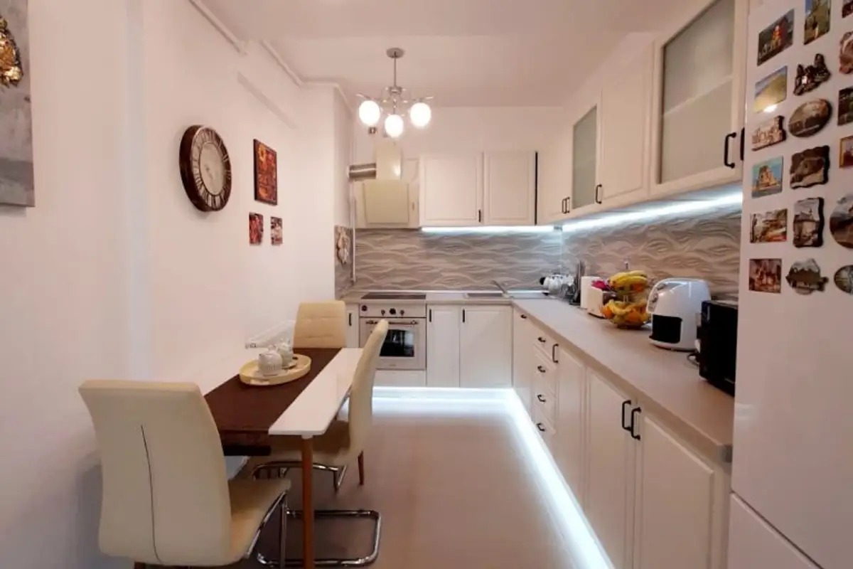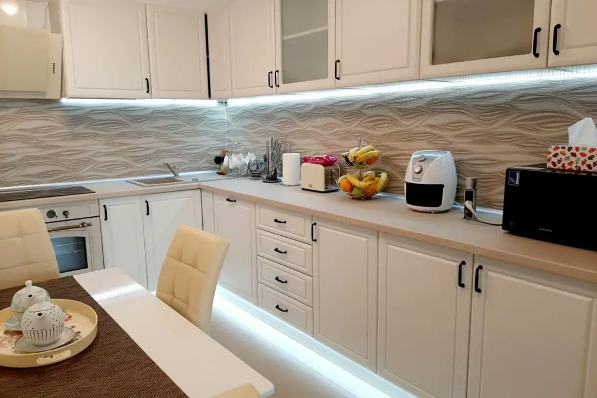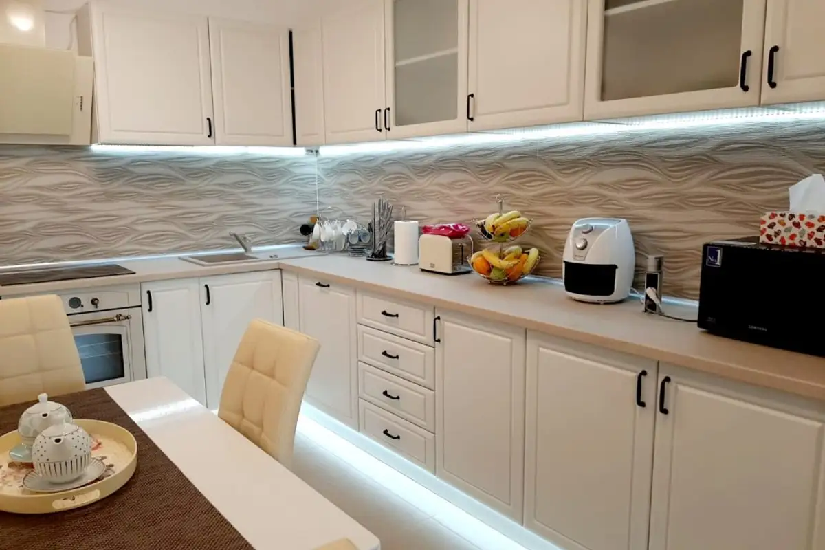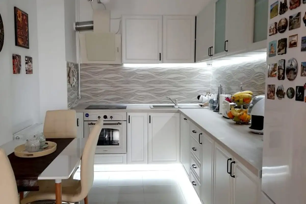 The kitchen furniture, with discreetly milled doors and a classic front appearance, was custom-made at a local company. The sofa in the living room, armchair and some decorative pieces were purchased from Mobexpert.