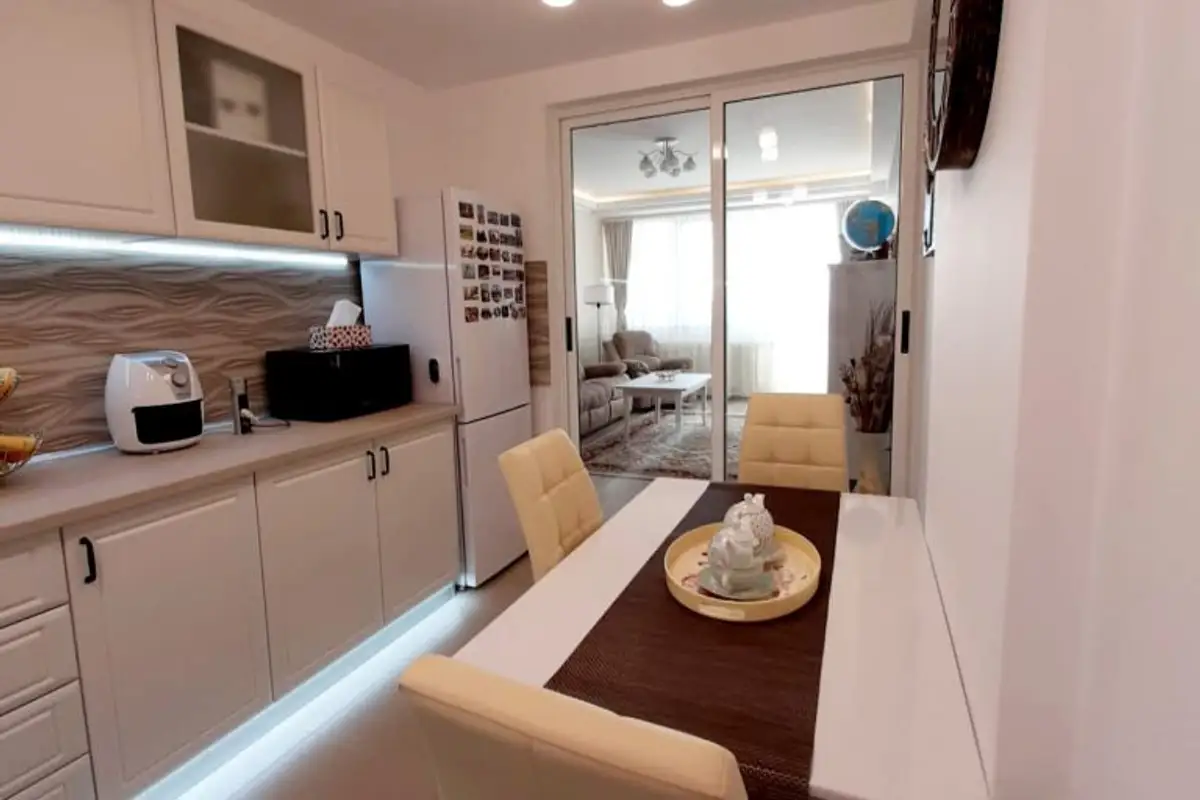 Claudia told us that the challenge was to furnish the home quickly and transform an empty, austere apartment into a welcoming home in as short a time as possible. The actual arrangement took about three weeks, with furniture ordered in advance and appliances purchased.