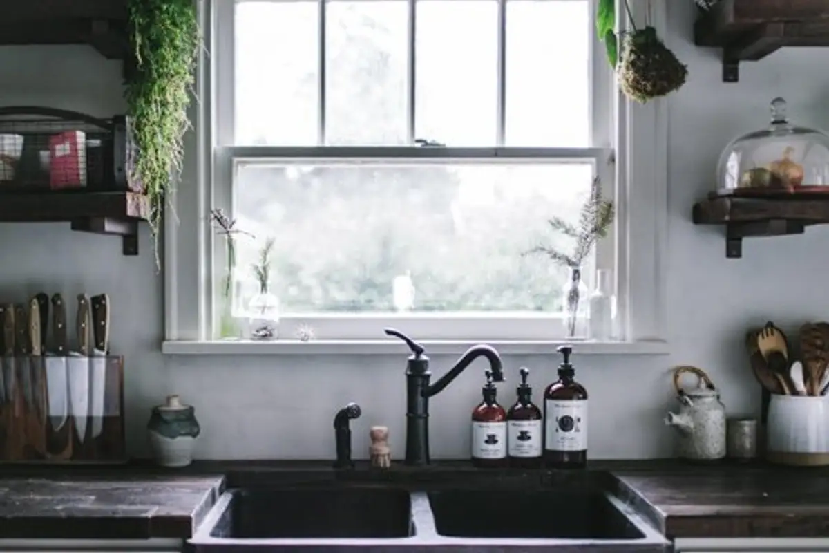 The focal point of this rustic-style kitchen is the area with the stove and the tree branch from which cooking utensils and containers are hung. It's an original aspect of the kitchen that undoubtedly attracts attention. Plants discreetly complete the decor while also acting as air purifiers.