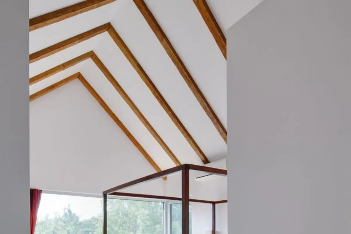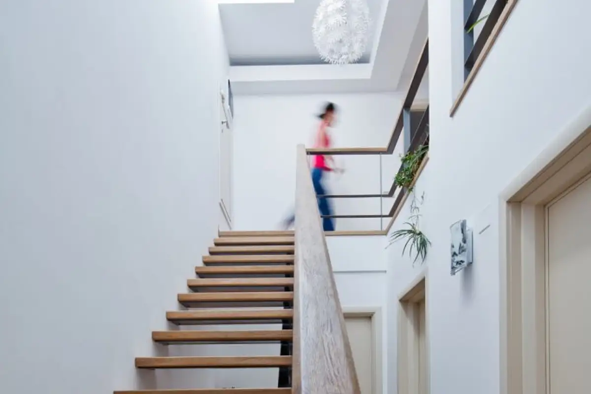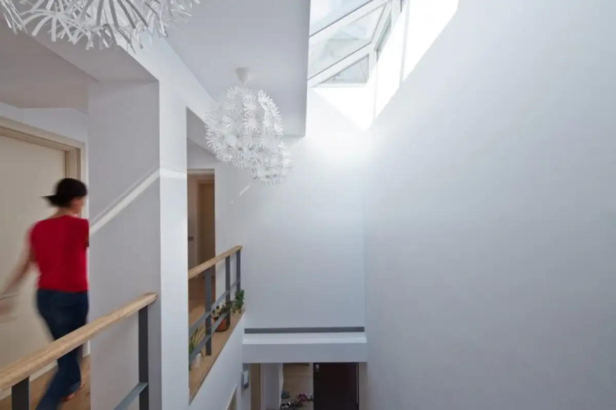 The house's position, perched on a corner at two heels, led the architects to find special solutions to bring light into the home, with a skylight above the stairs and a roof window over the small bathroom.