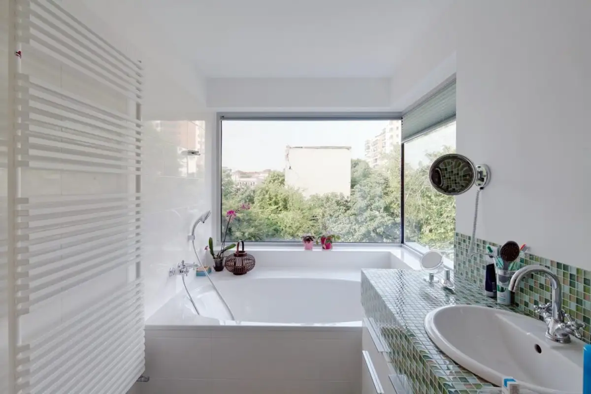 Each bathroom has a separate concept. In the master bathroom, the bathtub is a relaxation spot surrounded by large corner windows, without muntins or structural pillars to obstruct the view of the sky and the branches of the trees in the yard.