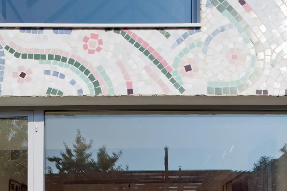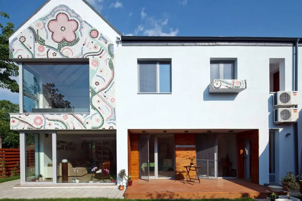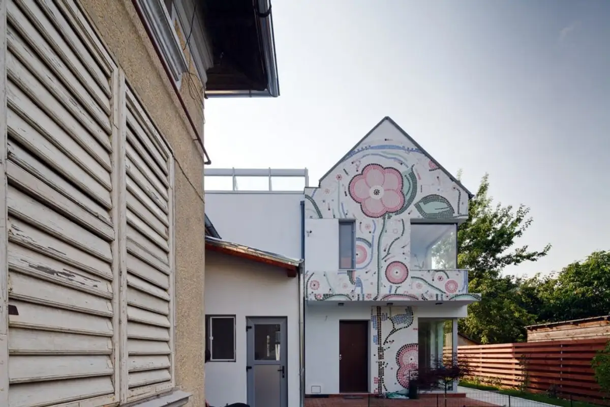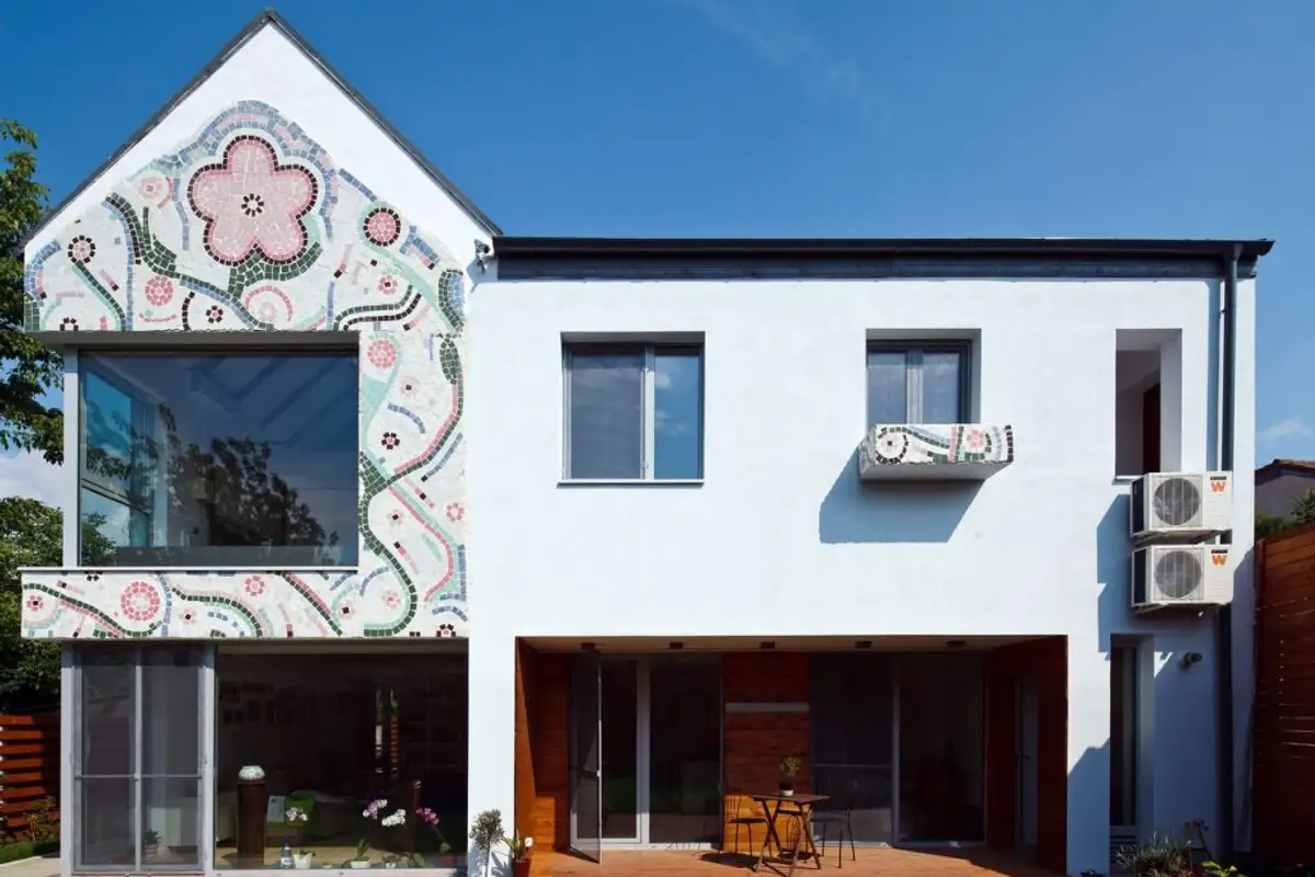 A remarkable detail is the mosaic on the house facade, continued in an original way inside the dwelling on part of the flooring, specifically in the entrance area. It was created by visual artist Laurentiu Macarie according to his own design.
