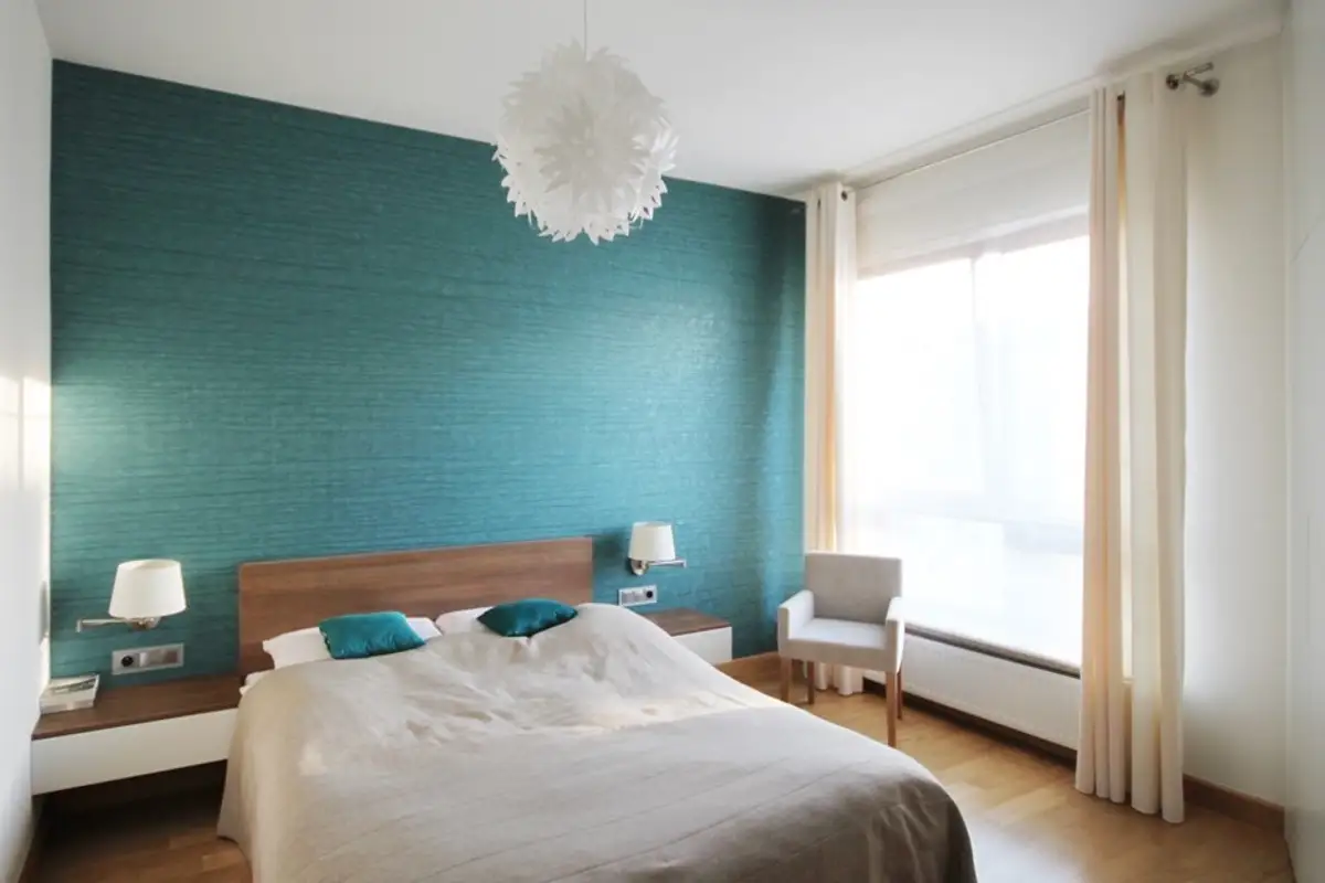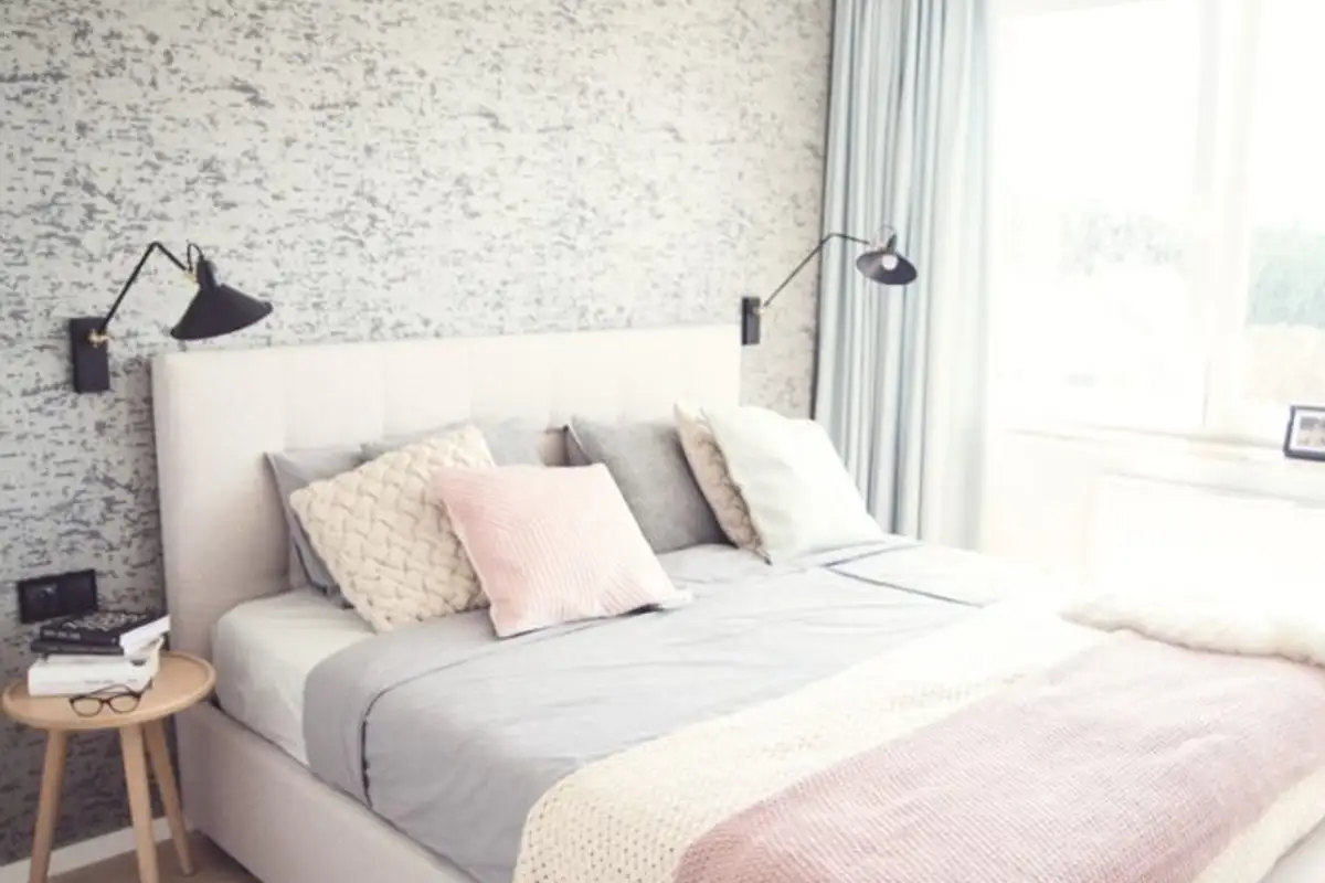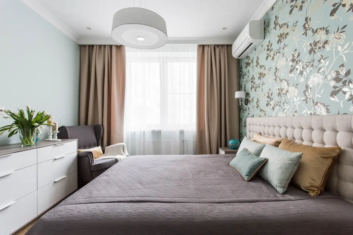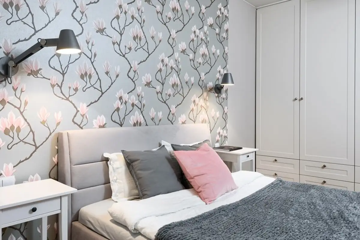 If you want more expressiveness, outline an accent wall, usually the one next to the bed. You can use a more intense color, apply wallpaper or a stencil with a subtle print that suits the atmosphere of the bedroom.