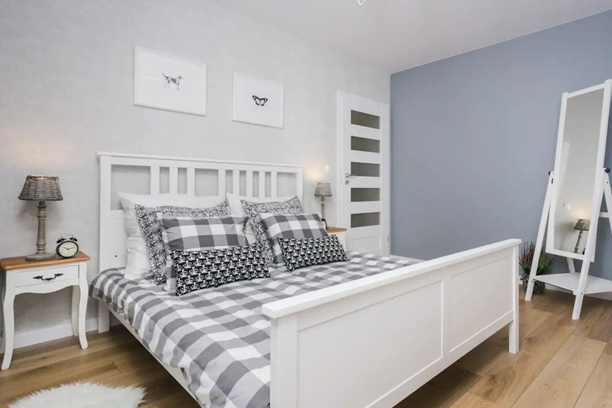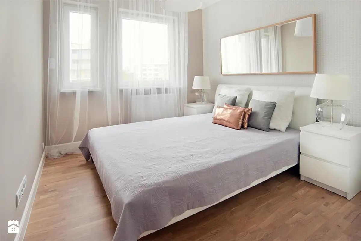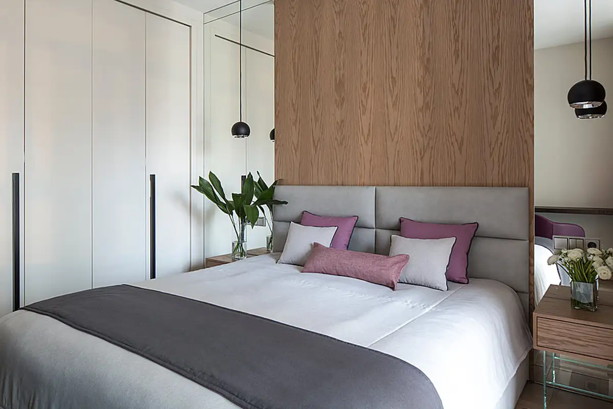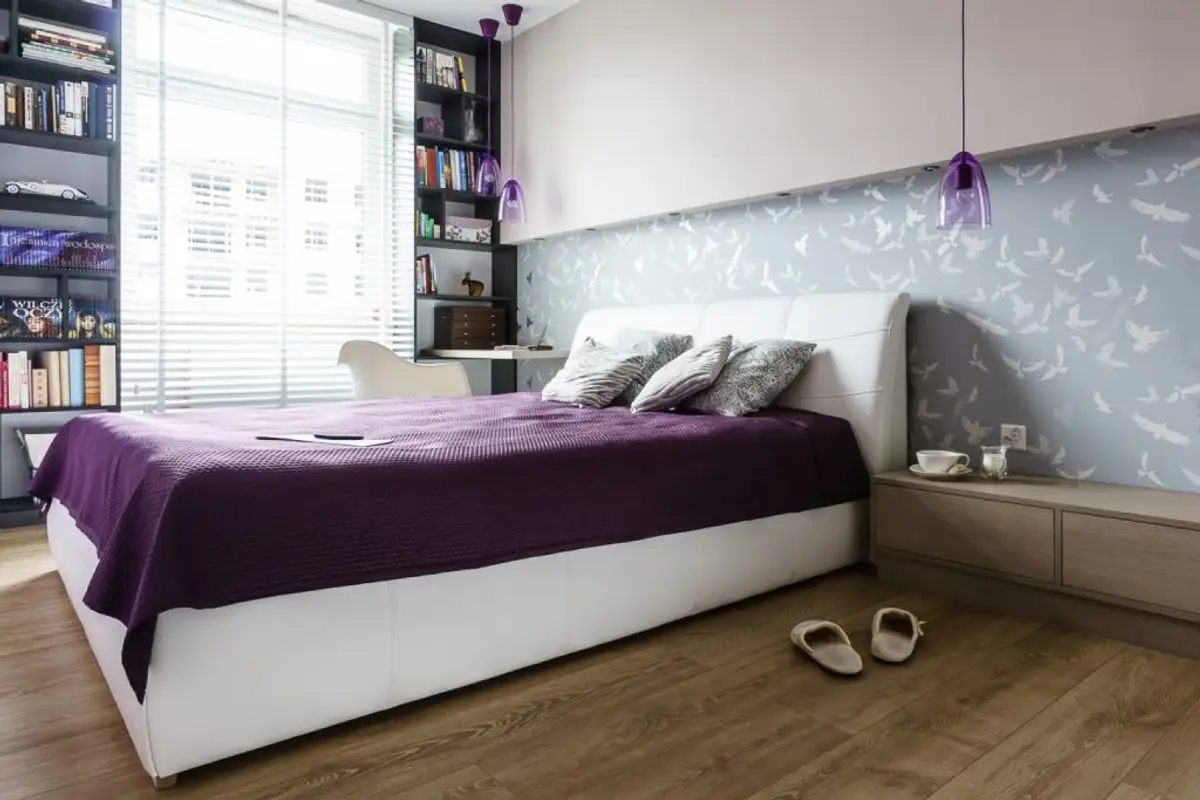 If you want more expressiveness, outline an accent wall, usually the one next to the bed. You can use a more intense color, apply wallpaper or a stencil with a subtle print that suits the atmosphere of the bedroom.