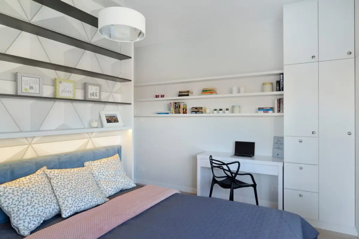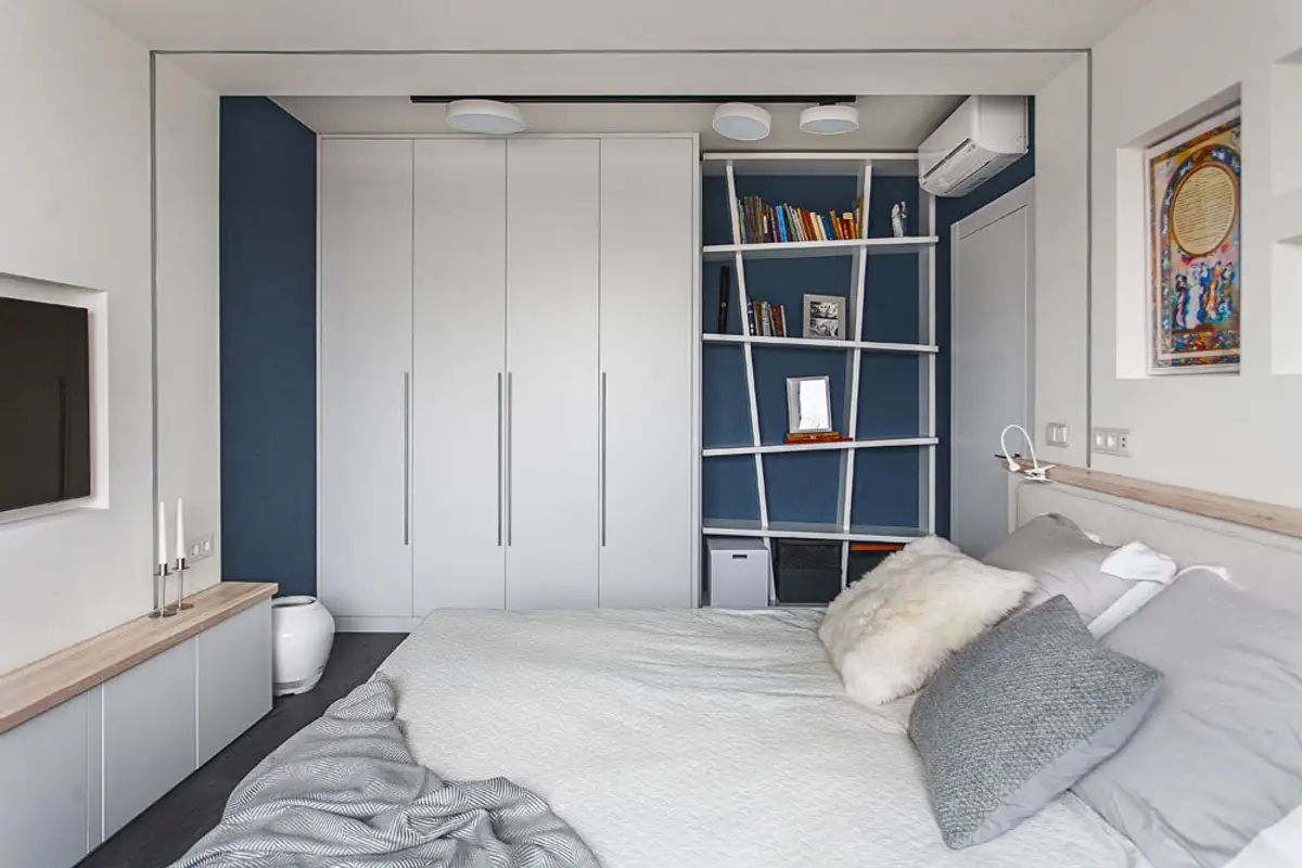 Most of the time, the wardrobe for clothes is located in the bedroom. A viable solution is to frame the bed with furniture, especially in smaller bedrooms. For freestanding wardrobes, we recommend choosing sliding doors; they are more practical in a bedroom of reduced size. We have detailed the subject of wardrobes and dressing rooms here.