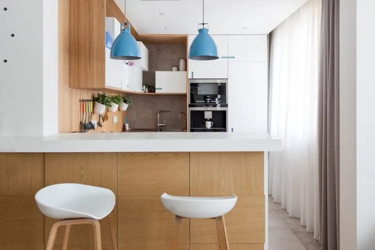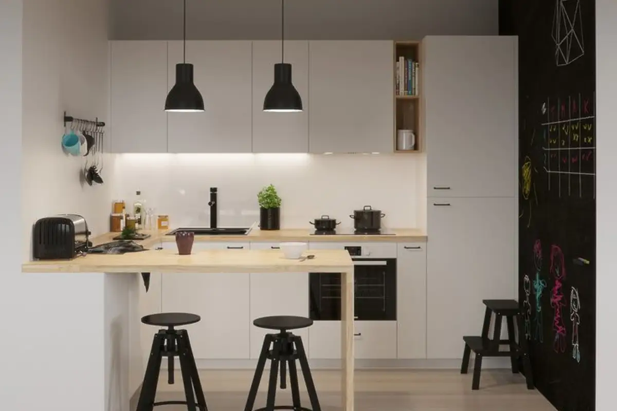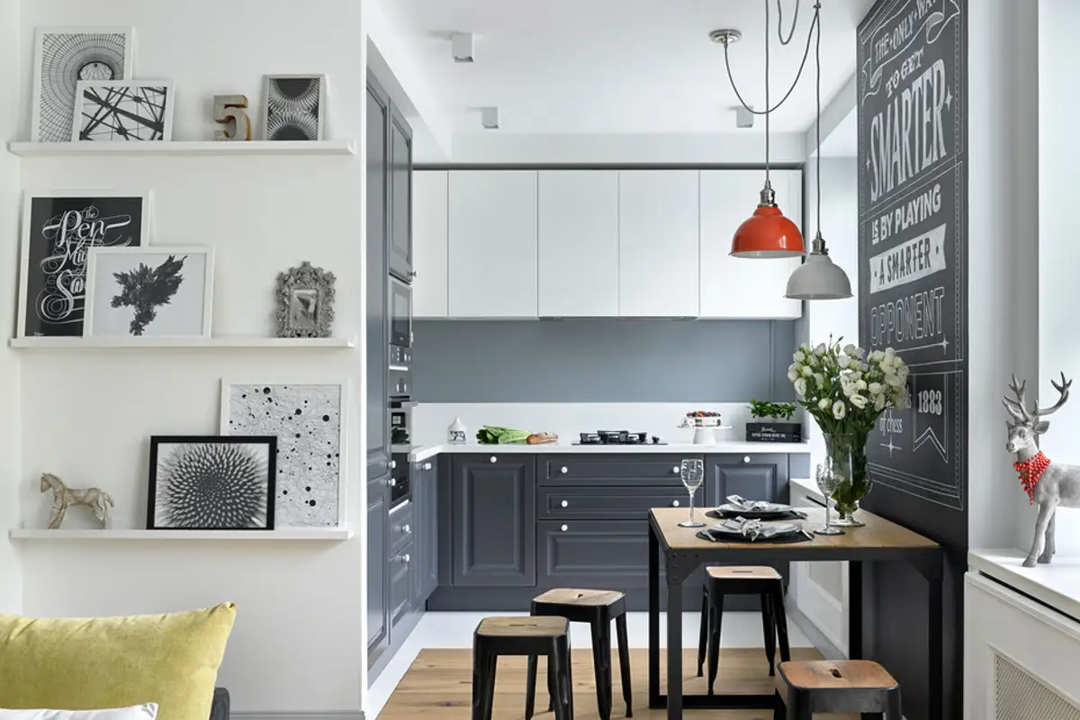 A suspended countertop mounted on the wall opposite the furniture can successfully replace the classic idea of a table, and when it comes to chairs, stools can be stacked, freeing up space in the room. In the case of open-space kitchens, a kitchen island unit can act as a dining area.