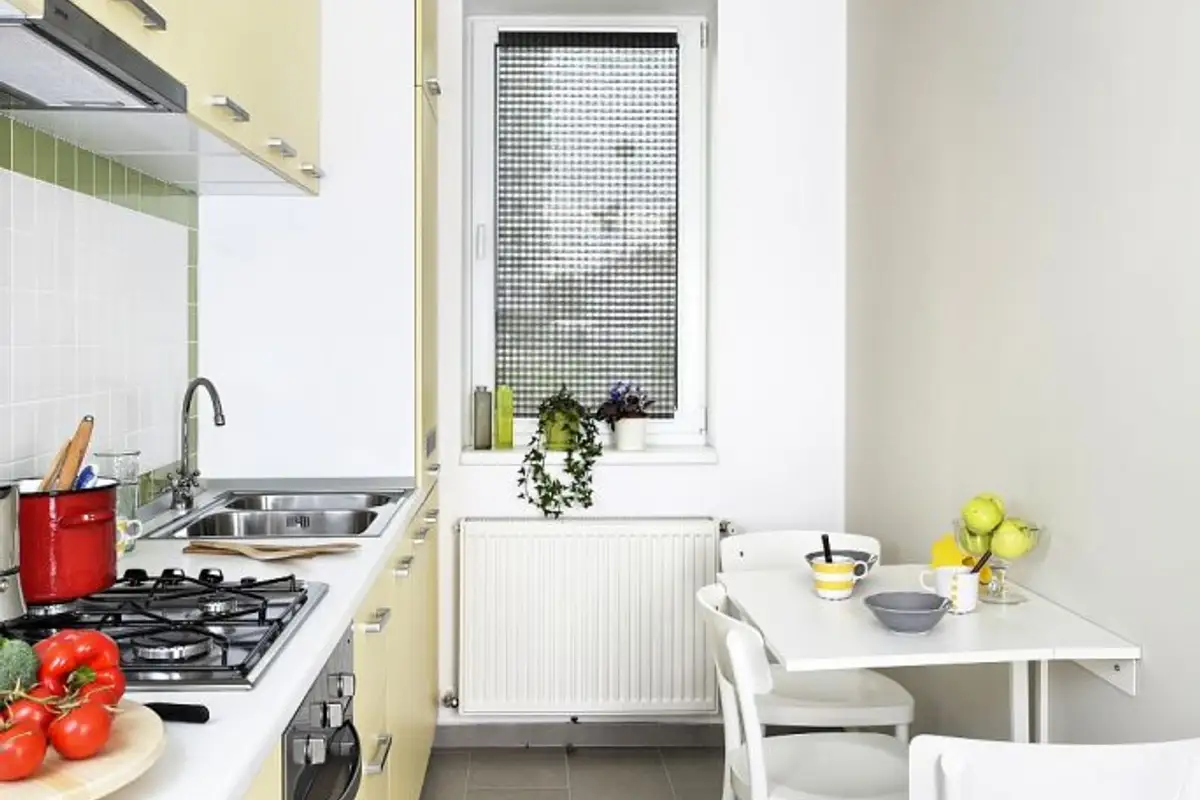 Foldable tables, which can be folded away when not in use, represent one of the handy options for small or very small kitchens. Depending on the space, foldable chairs can also be purchased. Its shape can be rectangular or semicircular. Extendable tables can also be considered, starting from two seats and potentially reaching four or six.