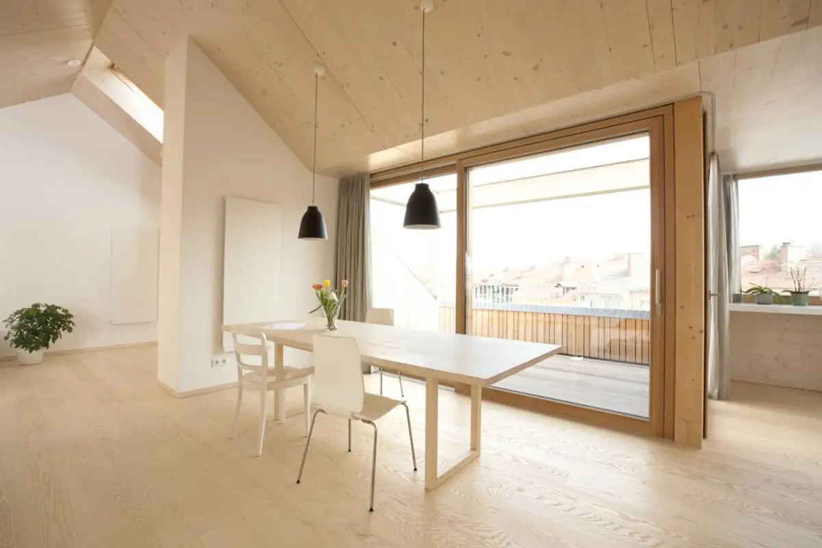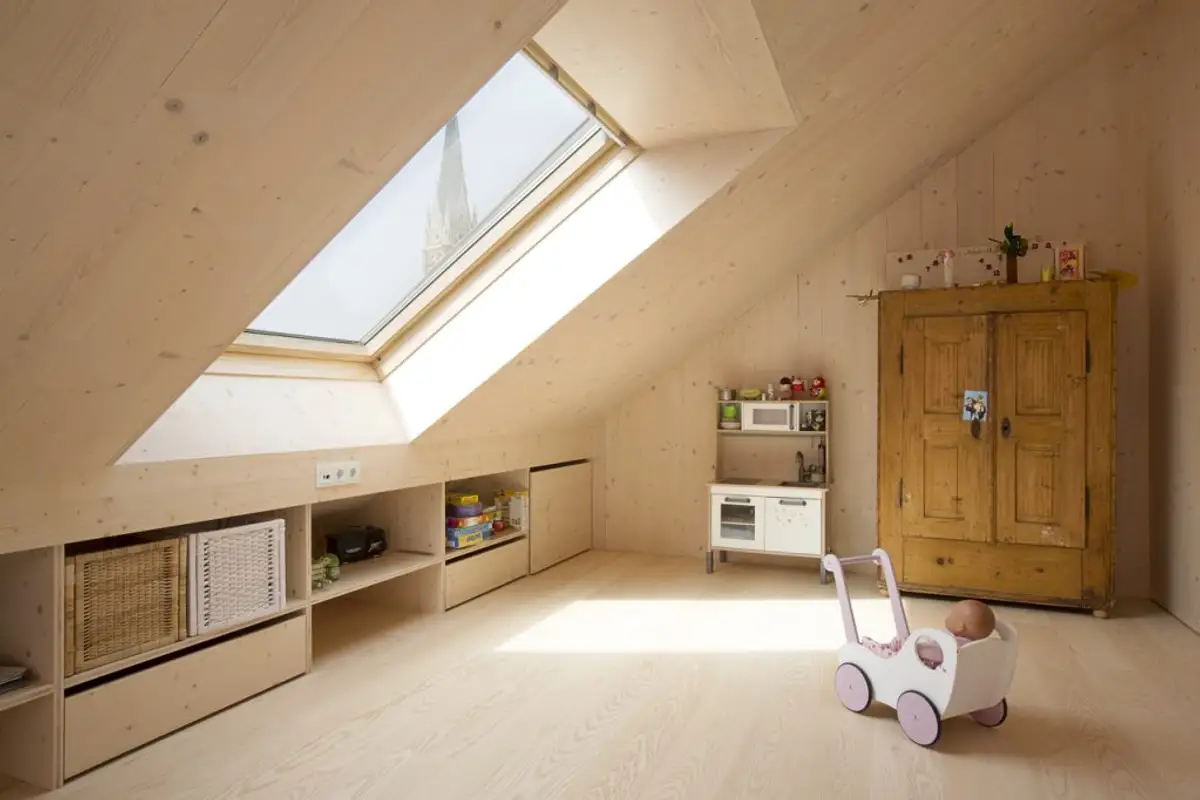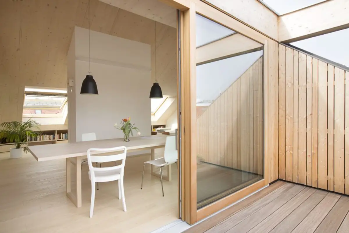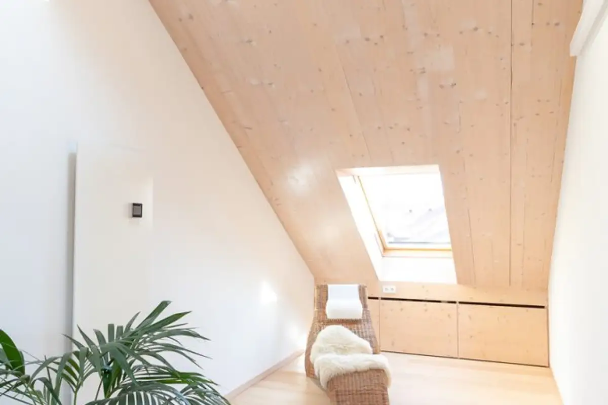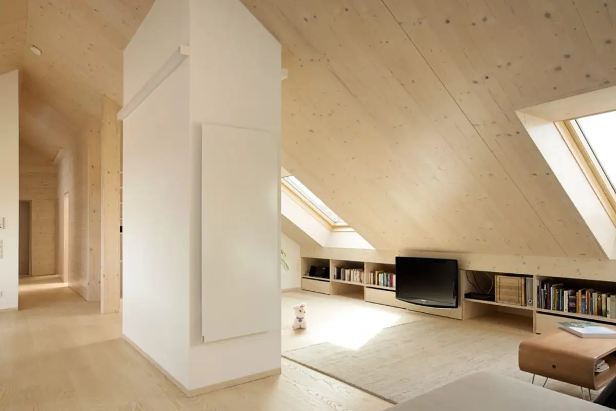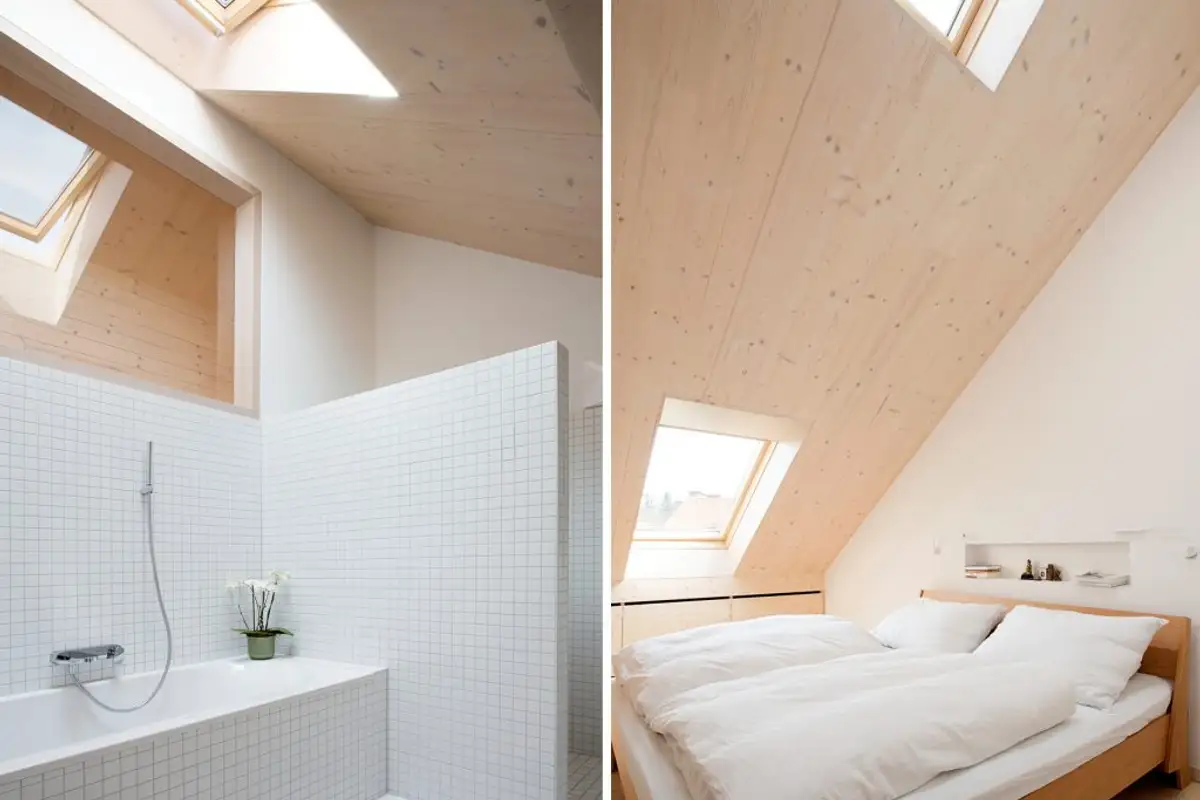Even on dark or cloudy days, there is no need for artificial light: "Especially direct sun exposure through VELUX roof windows brings generous solar gain, making the room feel even brighter and larger," says the architect.