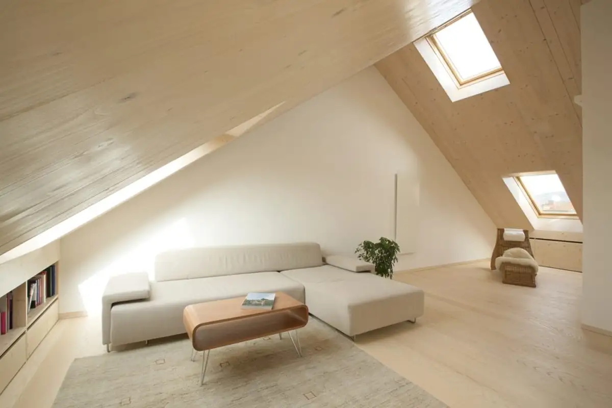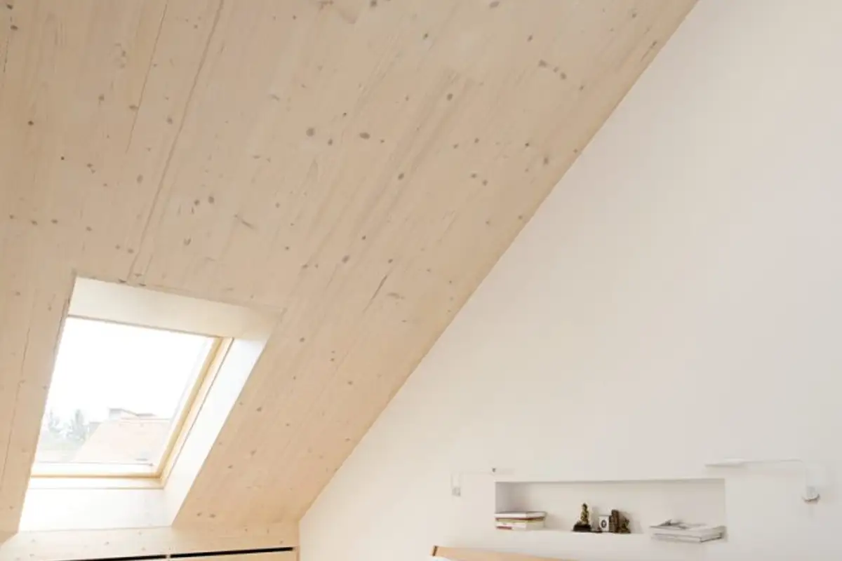 As it was a conversion project, the aim was to create a spatial volume corresponding to a quality dwelling. The entire roof structure was removed and rebuilt using veneer panels. These serve both to support the roof load and to remain visible indoors, creating a geometry of shapes.