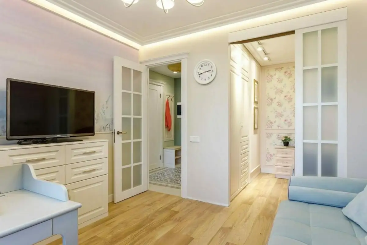 Initially, the apartment was open space; to meet storage needs and delimit spaces, niches were created in the walls for built-in wardrobes and dressers, and the bathroom was slightly enlarged to accommodate a washing machine.