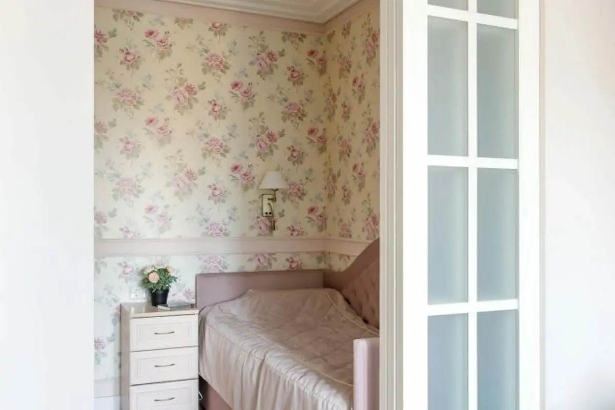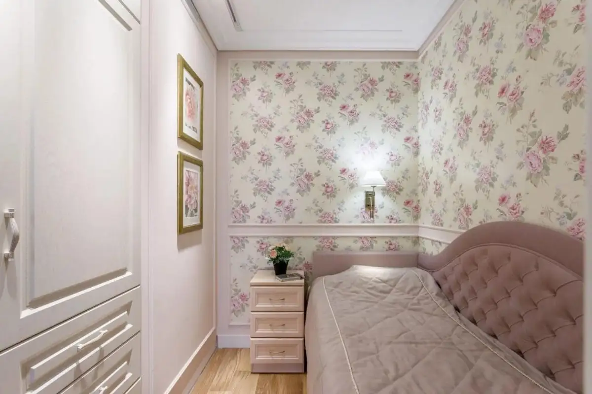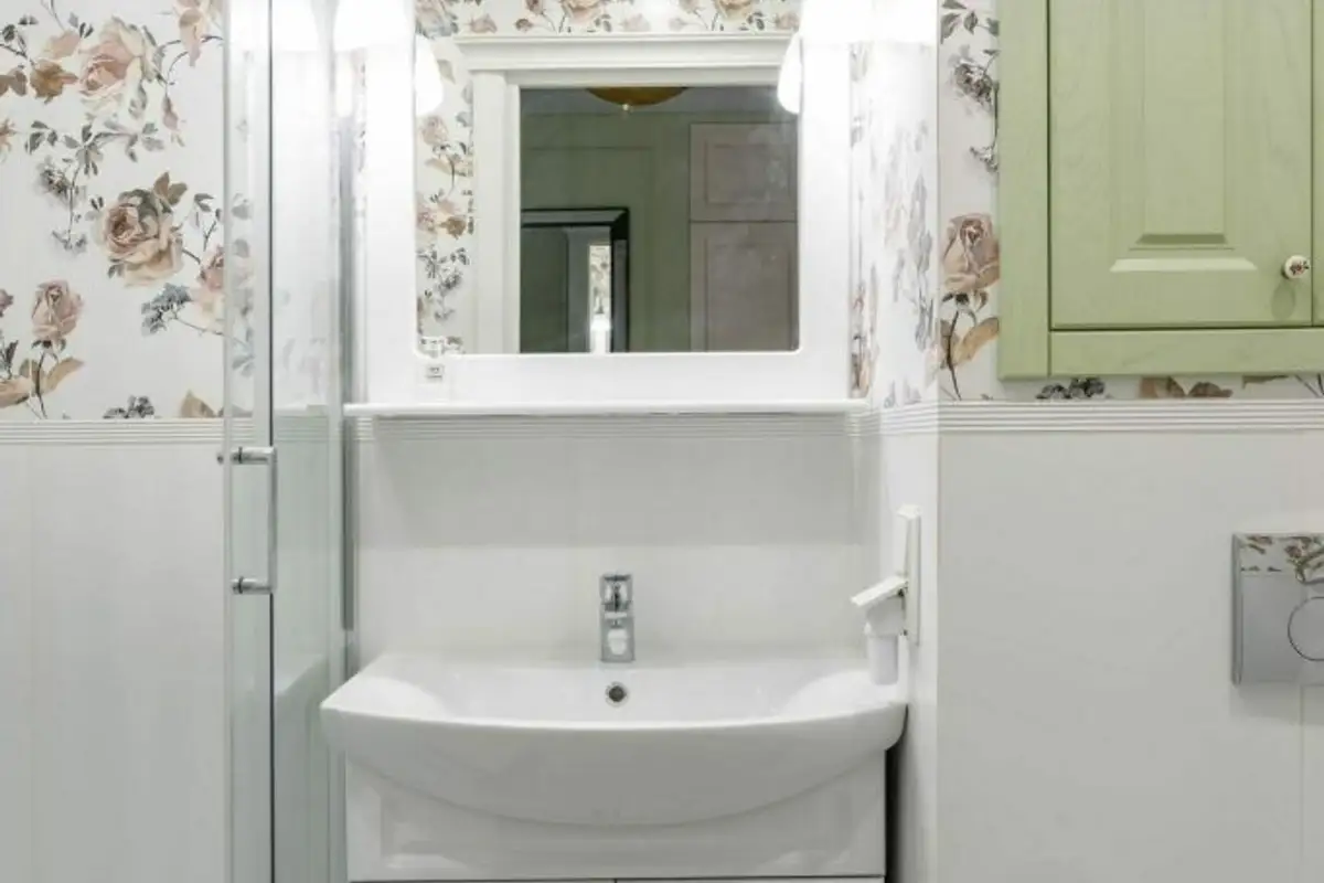 Floral motifs are present in every corner of the design and harmoniously complete the concept. Even in the bathroom, a wallpaper with floral motifs was installed on the upper part of the walls.
