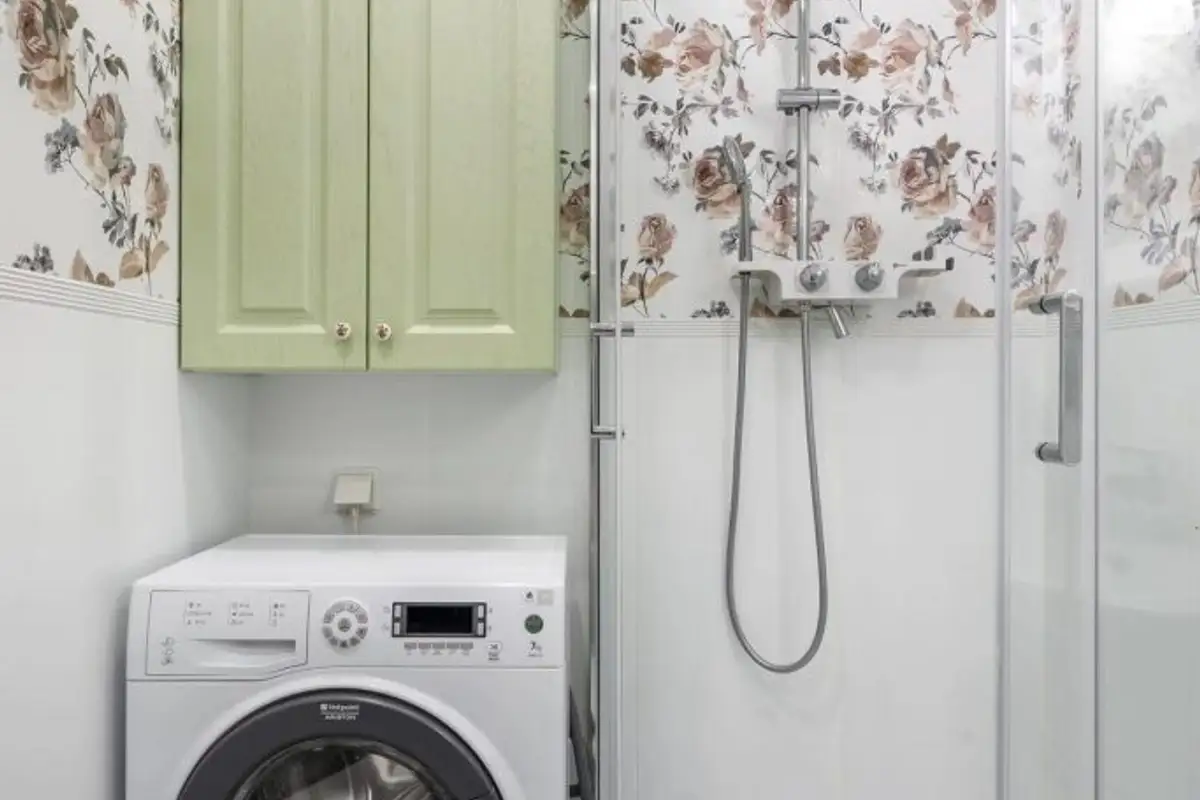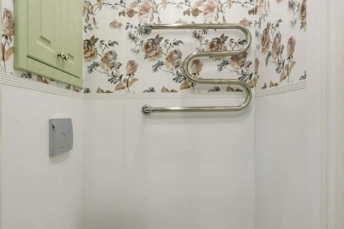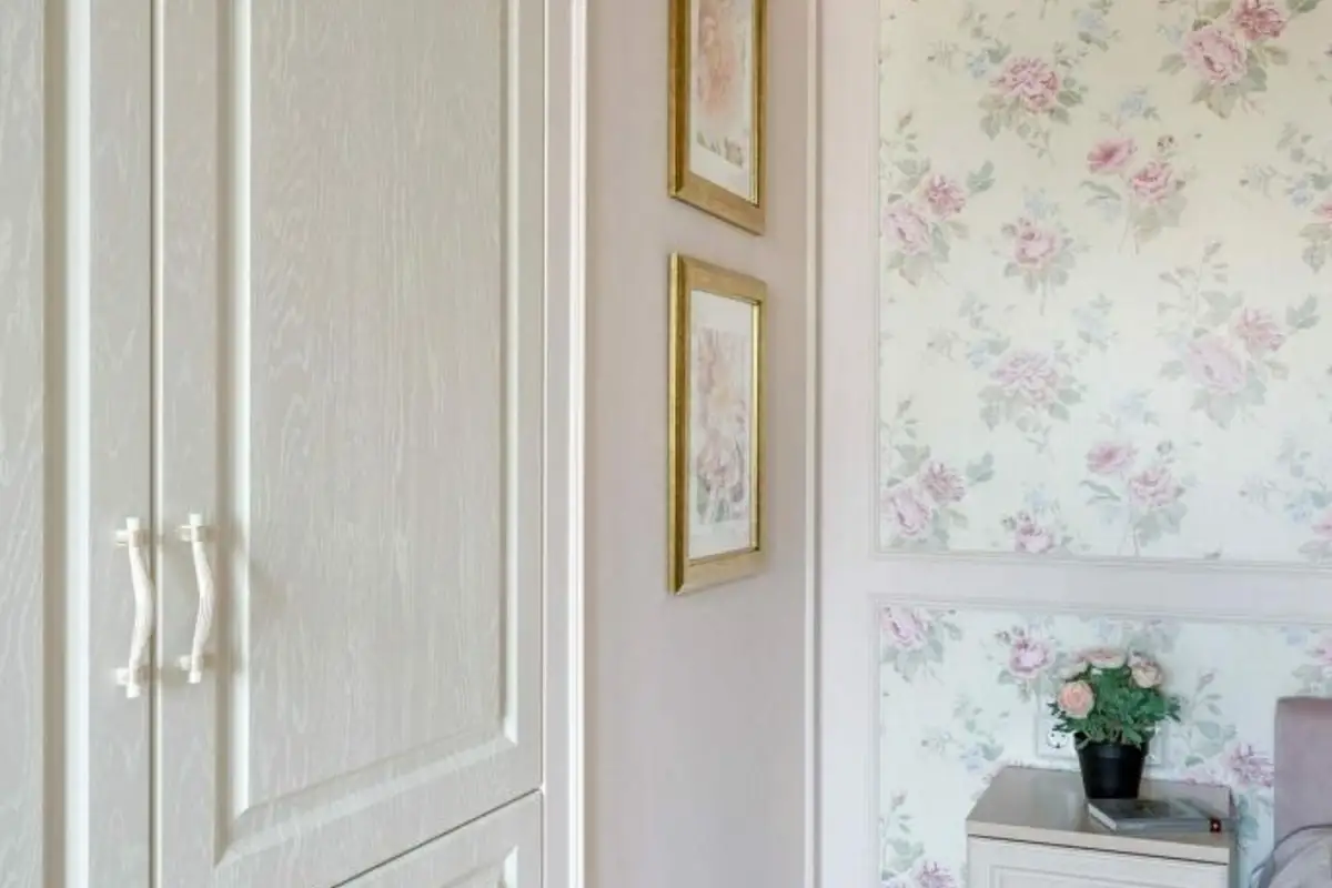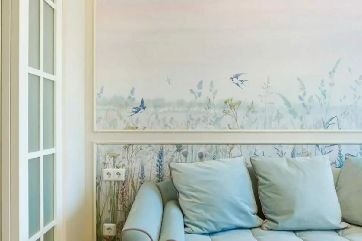 Floral motifs are present in every corner of the design and harmoniously complete the concept. Even in the bathroom, a wallpaper with floral motifs was installed on the upper part of the walls.