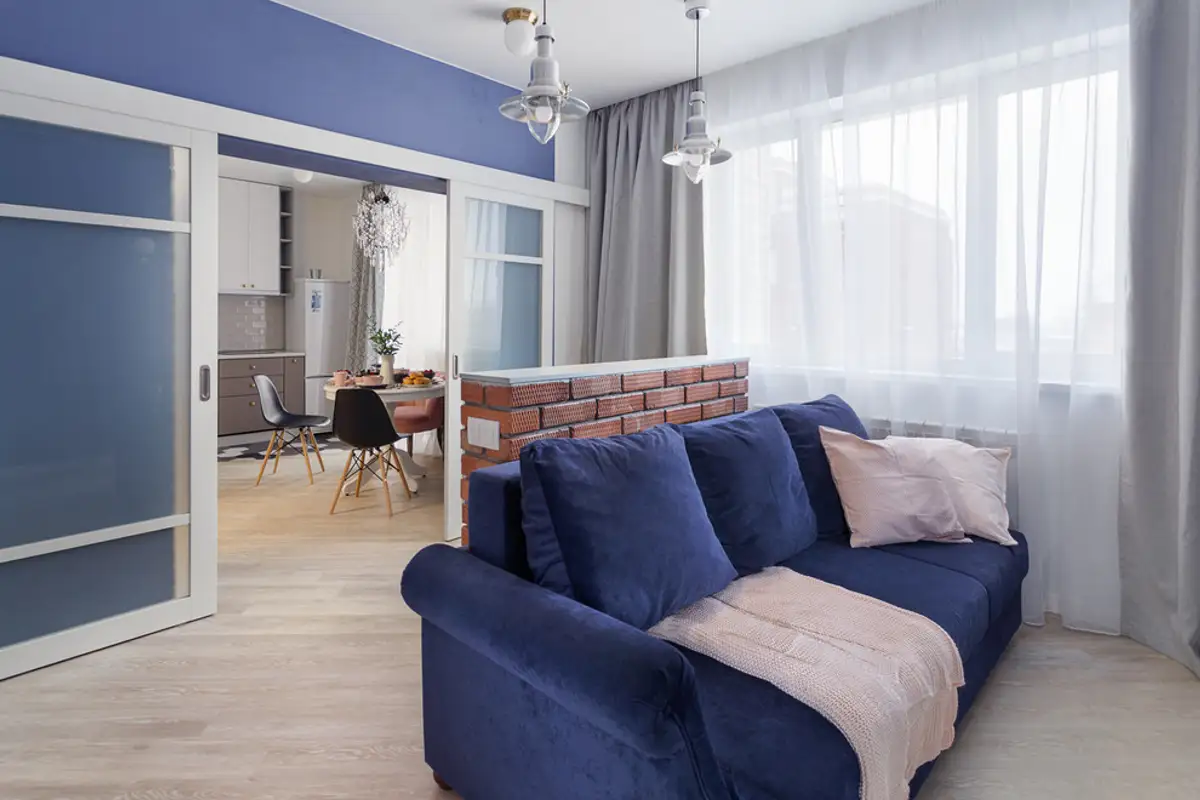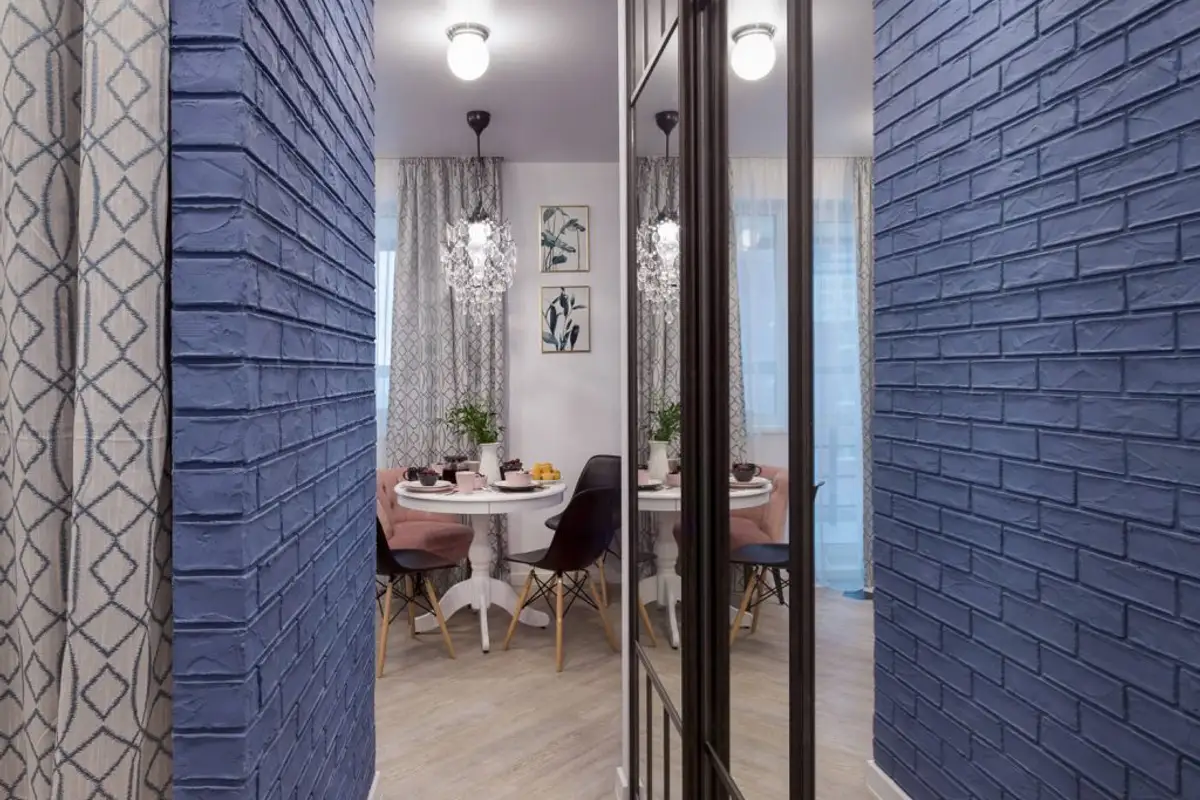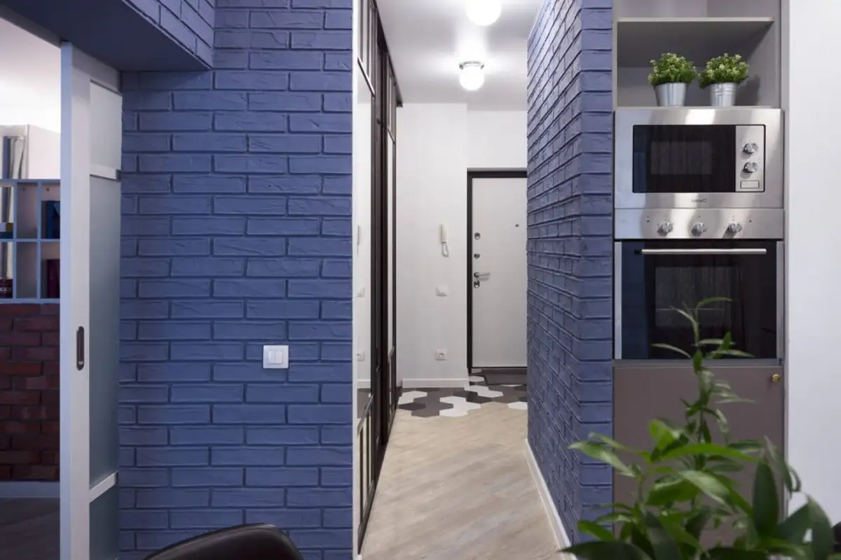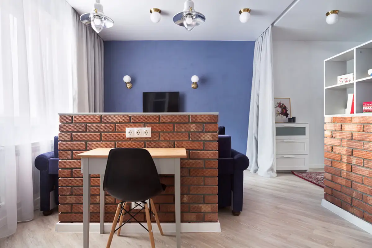 Placing the table near the doors is not accidental, it being a link to the living area. Here, the brick-textured partition wall appears once to delimit the sofa from a small desk and then to delimit the sleeping area. Blue is also resumed here, in the form of the accent wall that marks the TV area or the sofa.