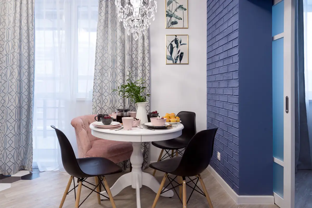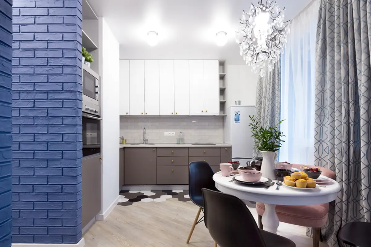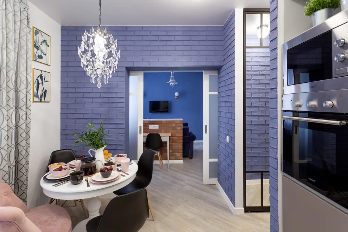 Chromatically, blue dominates the arrangement, complemented by the reddish hue specific to bricks. The rest of the space maintains a neutral base, with white balancing the accent colors used.