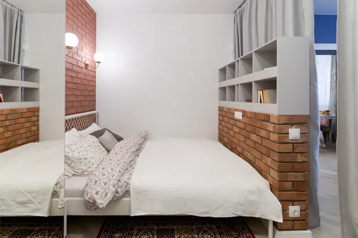 The small bedroom includes a bed and a wardrobe for clothes. The mirrors on the doors reflect light and enlarge the space. Once drawn, the curtain provides an extra touch of intimacy to this small bedroom.