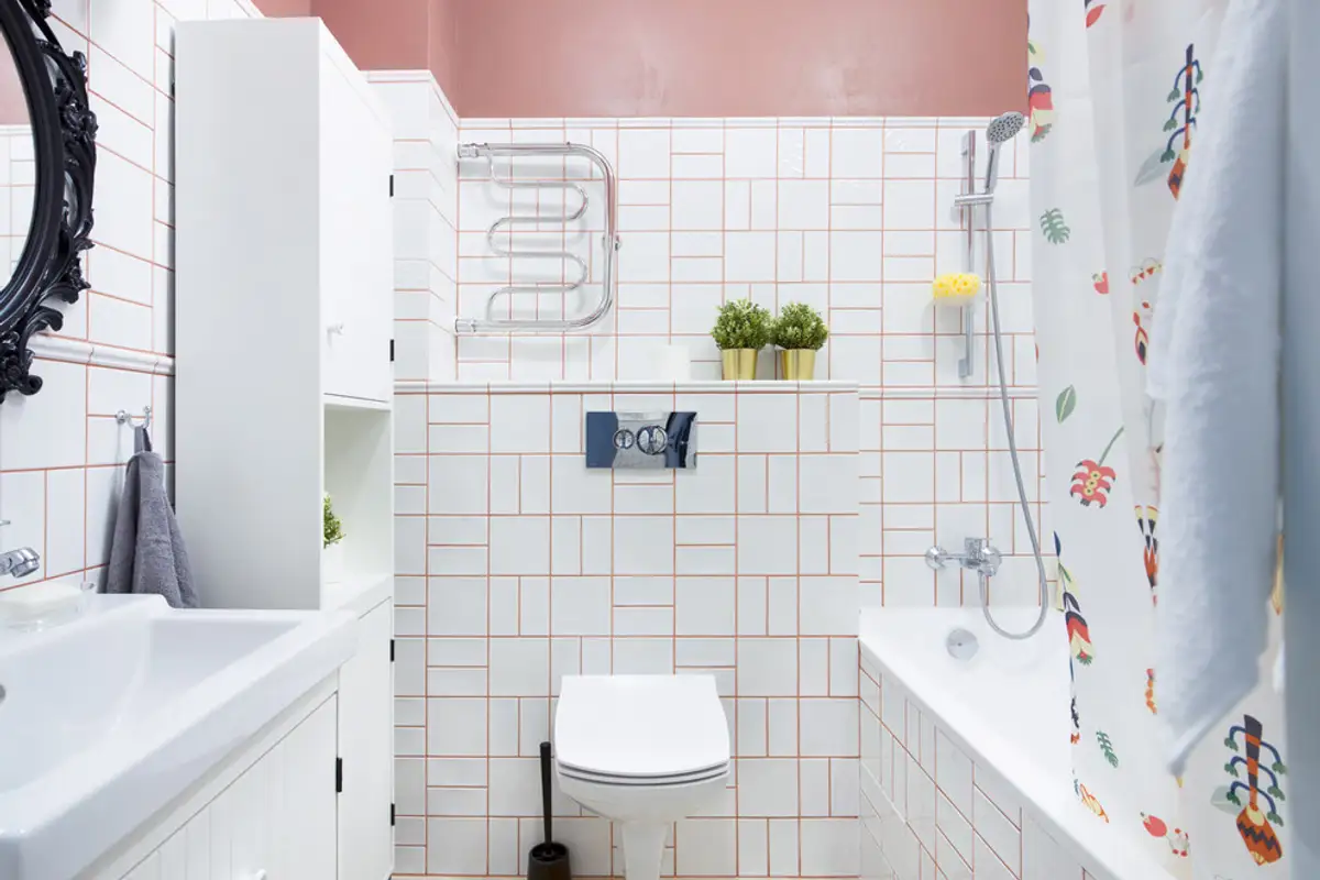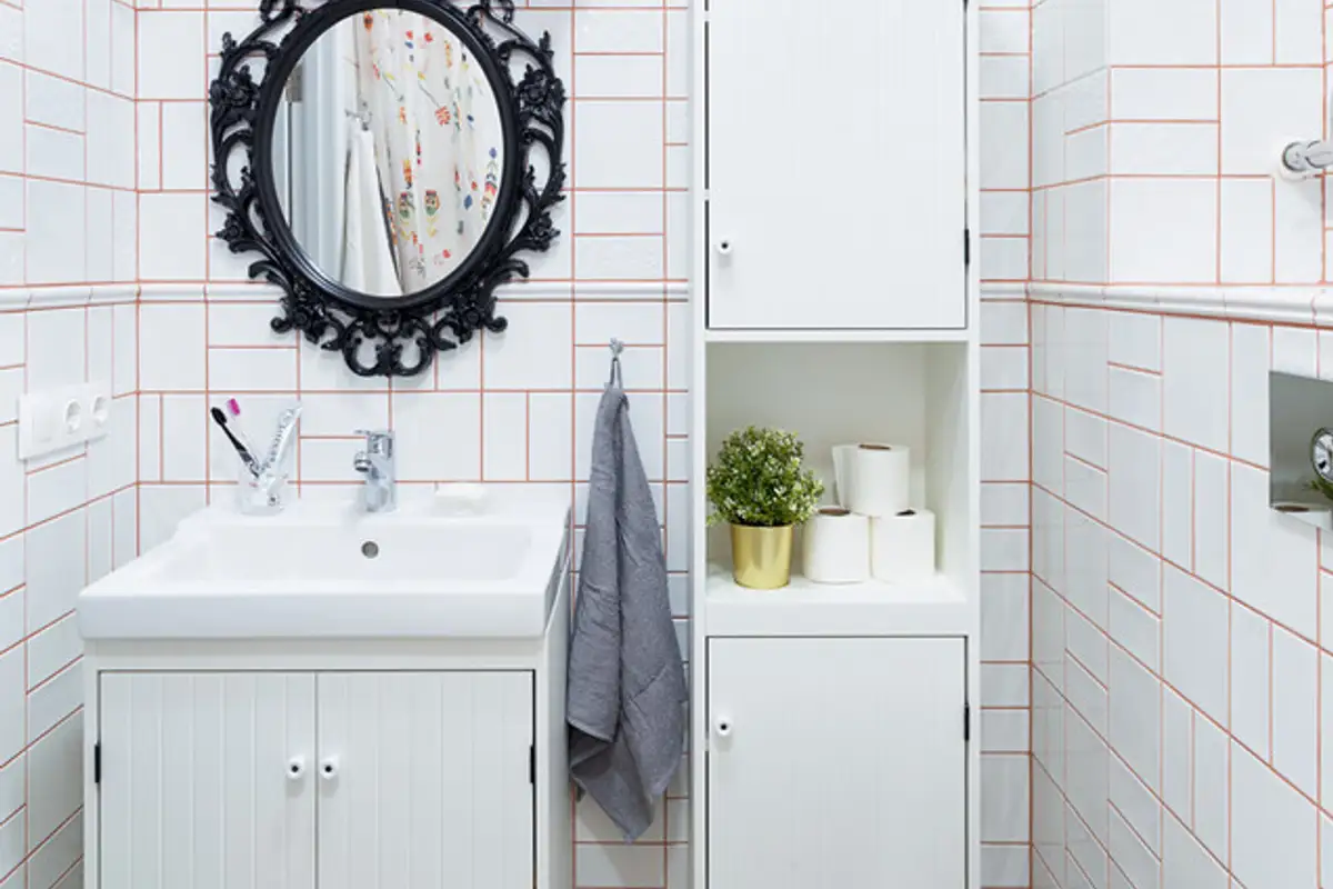 We will also encounter the unconventional in the bathroom, whether through the mirror, the arrangement of ceramic tiles or the painting of the wall in the upper part in a brick-like shade similar to the one used throughout the rest of the arrangement.