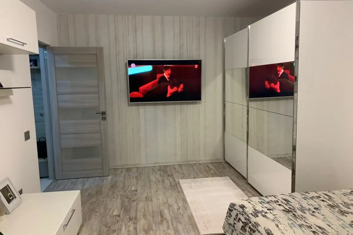 I considered that the television should be the attraction of the room, so I decided to place it on an empty wall, covered with a simple wallpaper. It is much easier to watch from the bed and healthier ergonomically (an upright position).