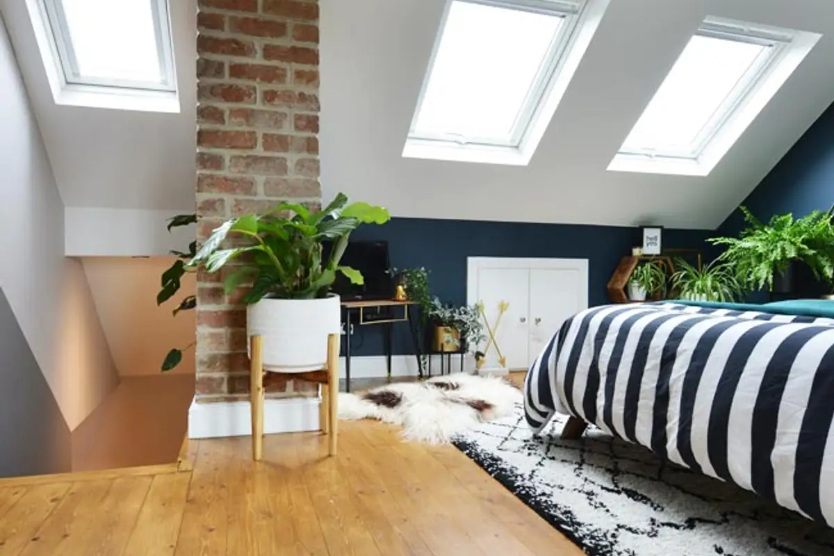 Indoor plants also benefit from a perfect growing environment, as they receive natural light during the day. I knew I wanted a dark color for the walls, and the contrast it creates with the natural light coming through the four dormer windows is wonderful! Then, I added the wooden parquet flooring and white and gold decorations, which I matched to the dark blue of the walls.