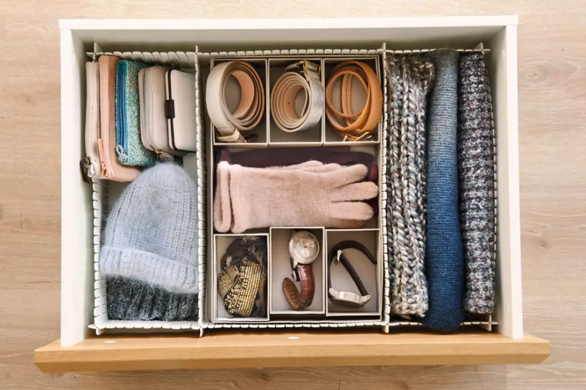 Sort clothes Use drawer space efficiently. There are various organization methods, one of which is recommended: organizing by category; arrange items vertically so that more will fit, as you will see in the image in the gallery.