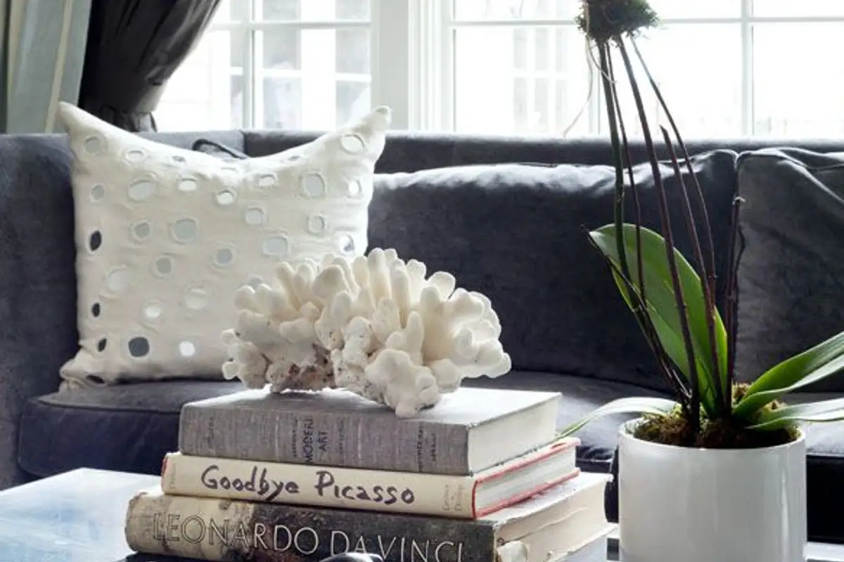 Whether you like to read or not, a library in the living room will always look good. And luxurious. Especially if you choose a few books with a special cover, metallic or that have a luxurious appearance. You can place a few on a coffee table next to the sofa as decoration, next to a vase of flowers.
