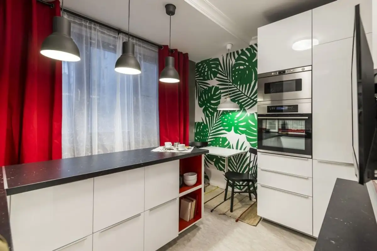 The black accents surprise you from the first image. You wouldn't expect to find black in a 10 square meter kitchen. And to make everything even more intriguing, touches of red have been added, along with a vegetal print in the form of wallpaper that highlights the dining area. It is, without a doubt, a bold approach.