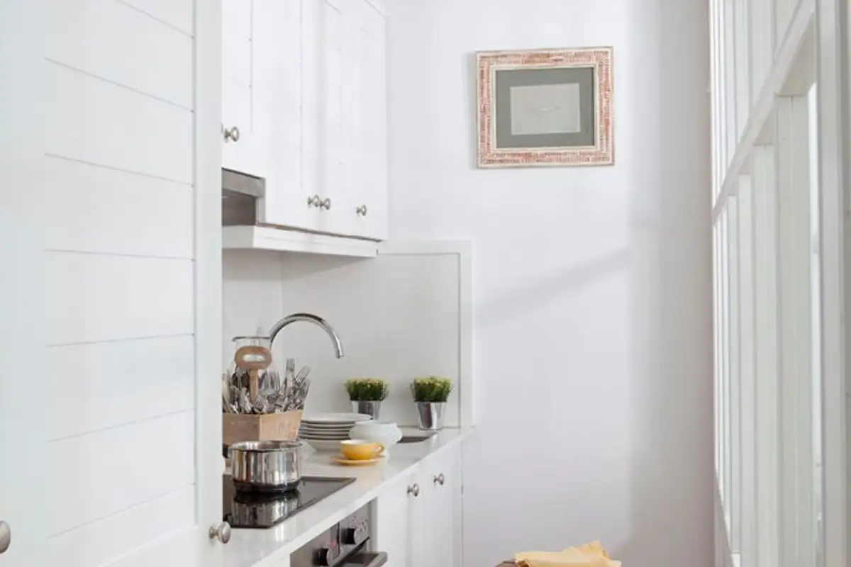 In a small space, the keyword is adaptation. If you dream of whole sets of pots, cutlery sets and colorful tableware with prints, utensils of all kinds, then you have to learn to say stop. In a small kitchen you can't have them all. But you can sort or choose only the essentials. Plus, it is necessary to keep things tidy.