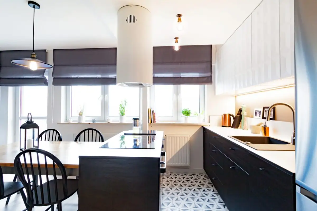 The same mix of black and white was used for the kitchen in appropriate proportions. The island-type unit increases functionality through optimal integration of the cooking area plus additional storage. The play of decorative tiles at floor level is discreetly echoed by the fronts of the hanging cabinets.