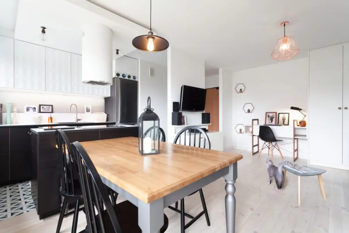 Removing the wall from the living room enlarged the kitchen space, making the room overall appear more spacious and brighter. With the new configuration, the two functions are visually delimited by the kitchen island and the dining area well placed in its continuation.