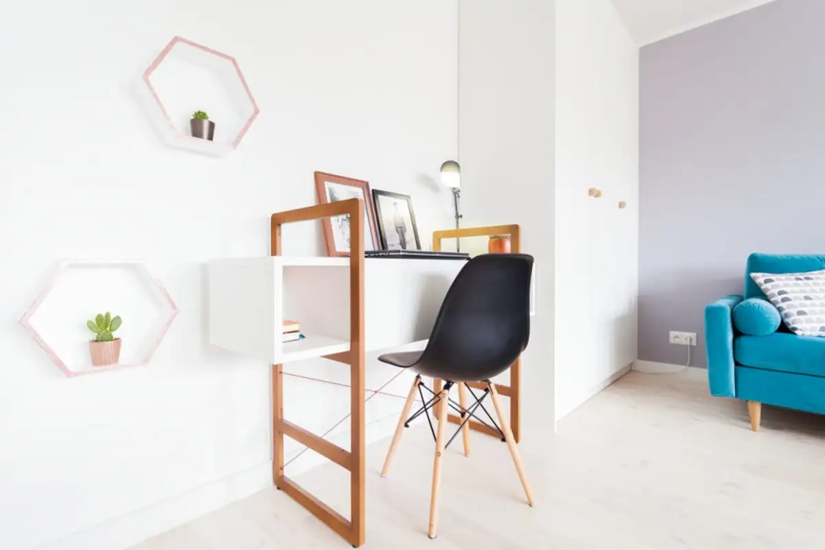 To increase storage space, the designers integrated a tall wardrobe into the living room, right next to the sofa. Being white and placed against a white wall, it does not overload the space. A small workspace was also introduced in this perimeter, with a white desk on wooden frames and a black chair.