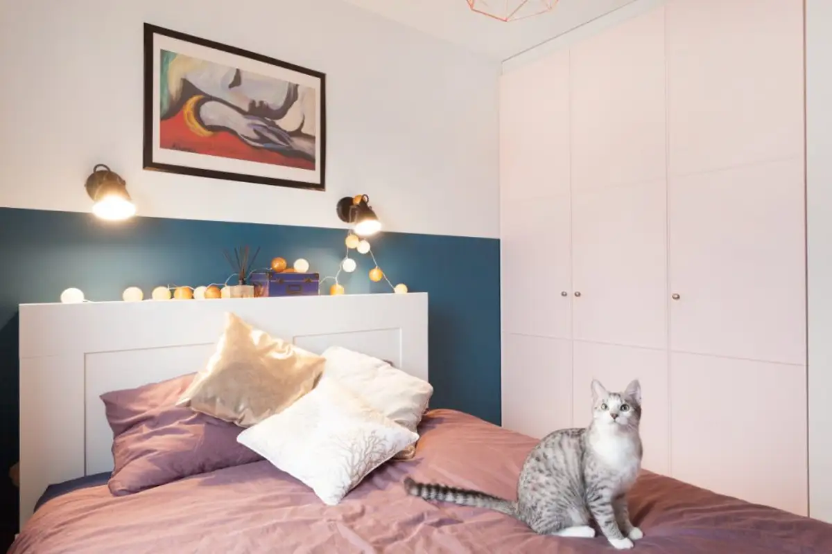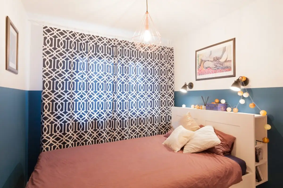 For the bedroom, the layout follows the same minimalist line, limited in this case by the reduced dimensions of the room. However, a bed with a headboard incorporating small storage areas and wardrobes for clothes could be integrated. The walls around the bed were painted halfway with a pleasant blue intended to distract attention from the existing small space.