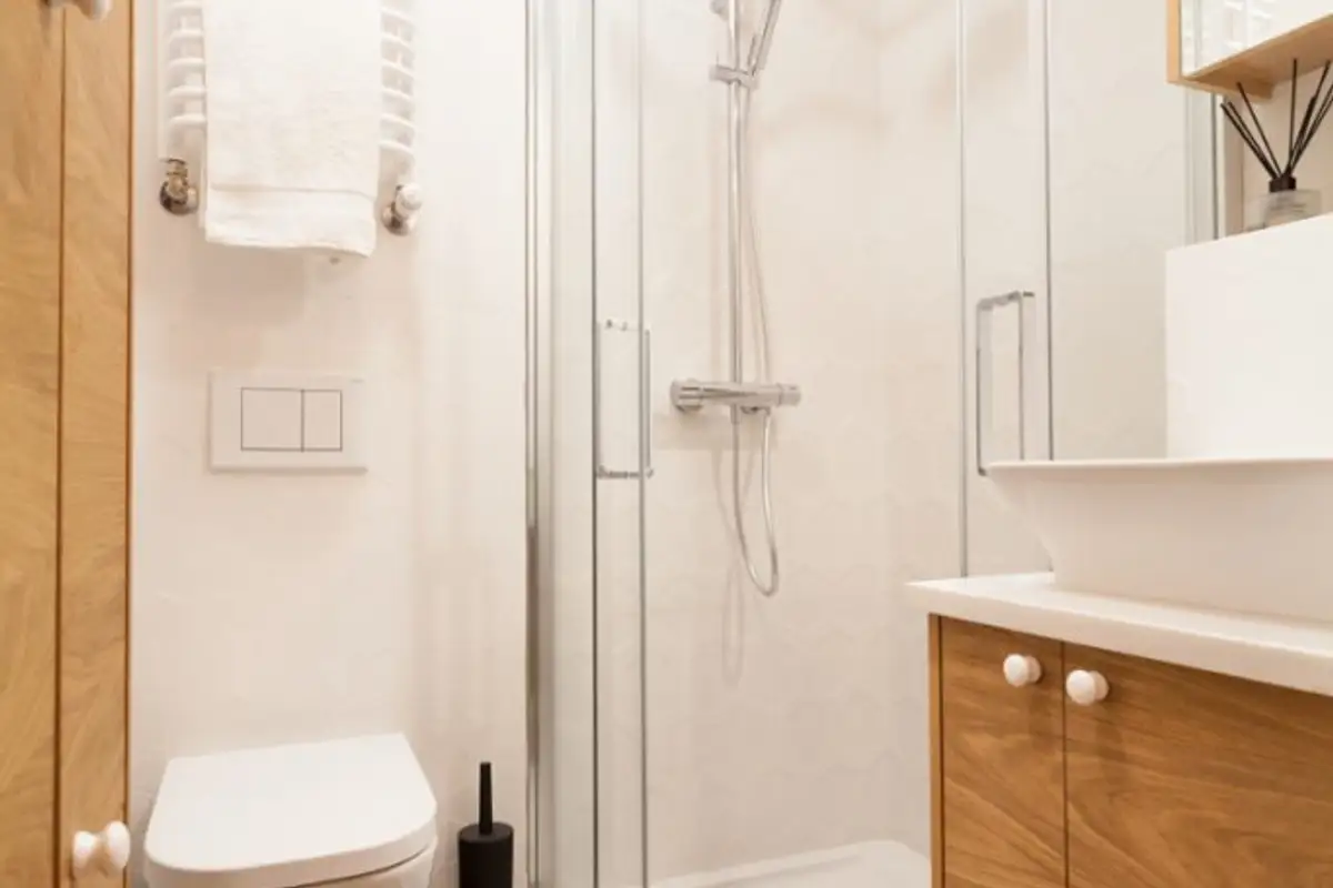 In the bathroom space, everything was optimized as much as possible. A shower cabin was chosen instead of a bathtub, and the glass walls ensure transparency so that it is not perceived as an object occupying space.