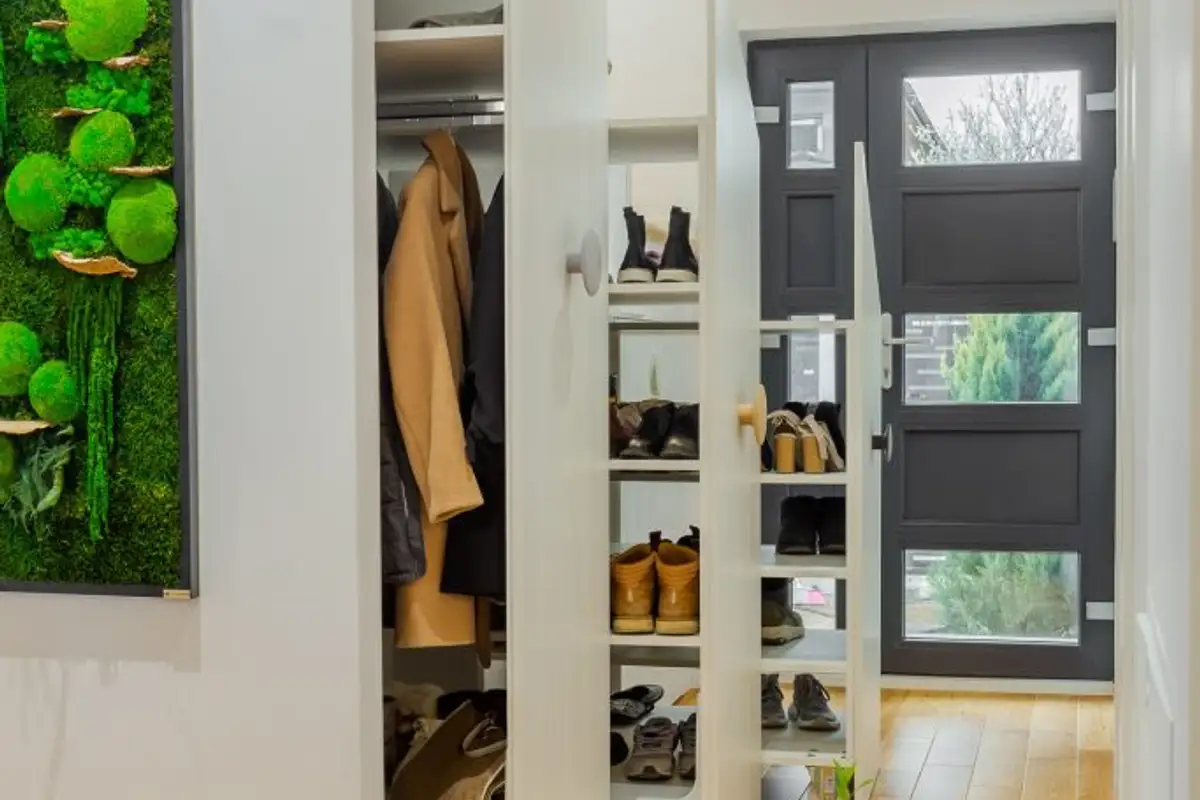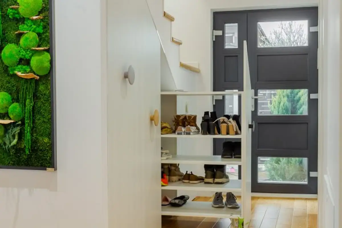 We maximized the space under the stairs using custom-made furniture pieces carefully created by Mr. Cristi Staicu, who followed the line of the steps and created sliding systems under the stairs for the hallway wardrobe and extra storage in the kitchen.”